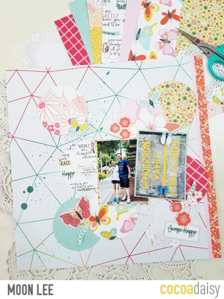 Moon Lee realized after she trimmed the circles out, that they were a littel bit smaller than she wanted and used them as the background instead. I love the bright colors and all the embellishments.