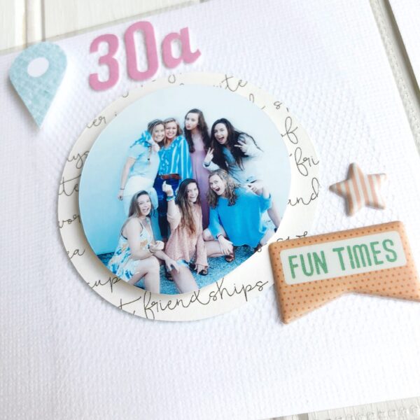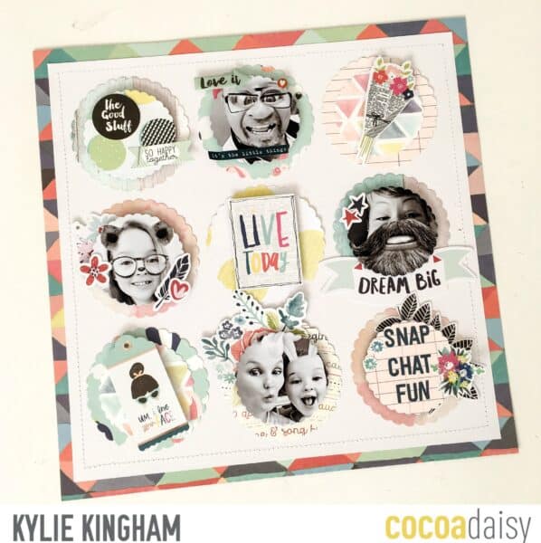 Kylie selected a theme of papers from many past kits from the last 12 months as well as different die cuts and stickers. I love how she used a scalloped die for her circles and foam tape to the back of the top circle to give dimension to her layout. I love the extra detail with the stitching. Snap Chat filters are so fun!!!