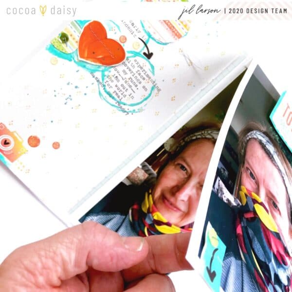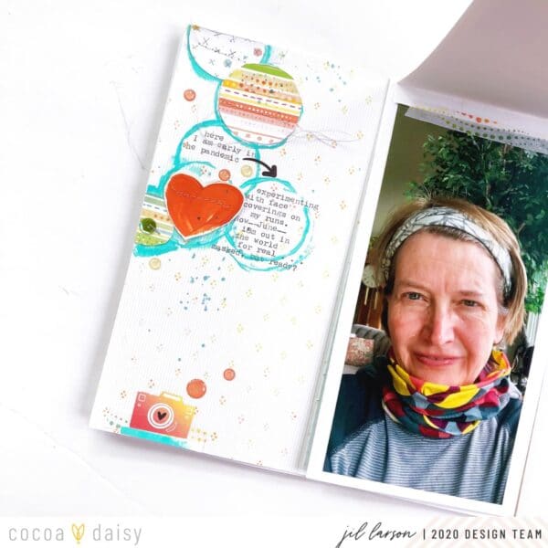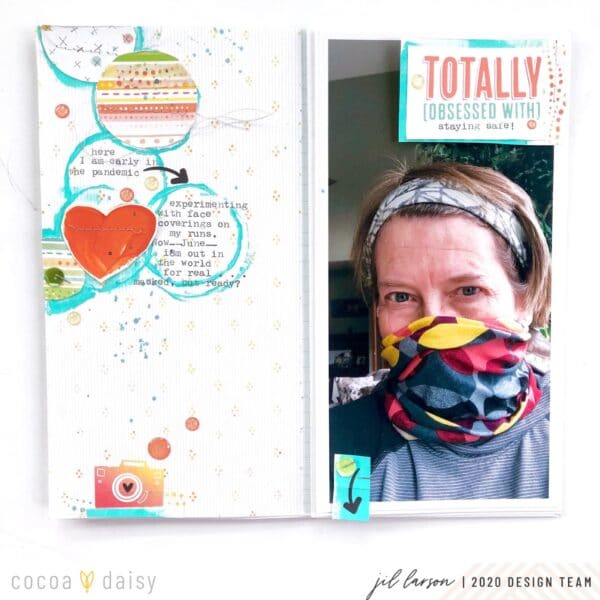 “Finally, I made the full-length photo a flip-up, including a mask-free photo of myself under the neck-gaiter selfie. The little painted tab with the arrow rub-on indicating something underneath was my final touch on this interactive side of the layout.”