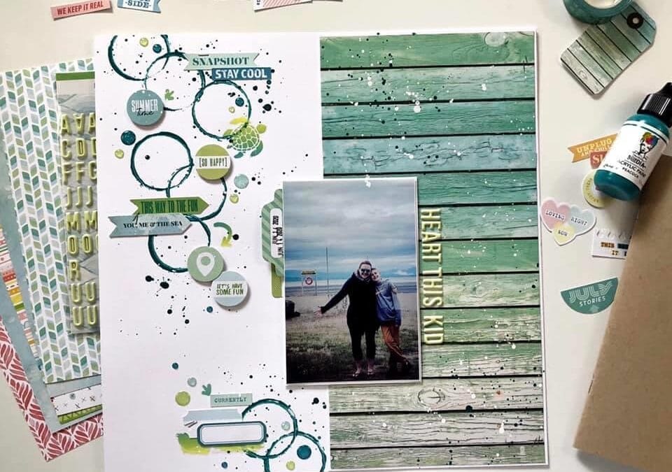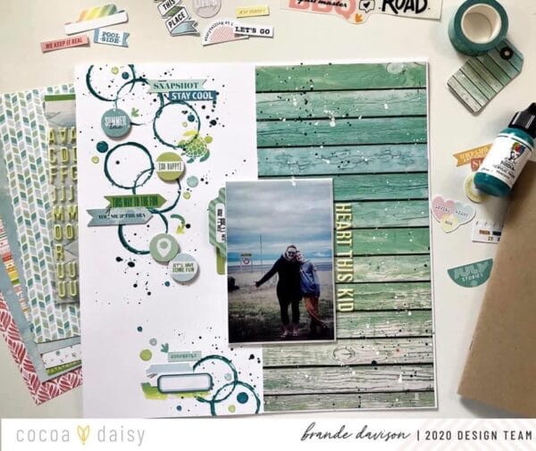 “A finished off with a title ‘heart this kid’ using the kit alphas and some splatters with white acrylic paint. I love how it turned out … I think I have a new go-to sketch!”
