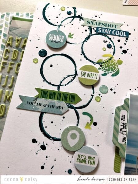 Next we have a TN layout by Jil. “I followed the sketch included in the To the Sea TNMK kit. Delighted to see the turquoise paint in the kit, I happily used it on this page. The sketch shows loosely stamped circles, and I created mine with a paper towel cardboard core. With extra paint, I simply painted a small piece of white cardstock, which I had on hand to cut into a tab, a tiny border, and a mat for my title. This helped me get the turquoise moving around the page.”