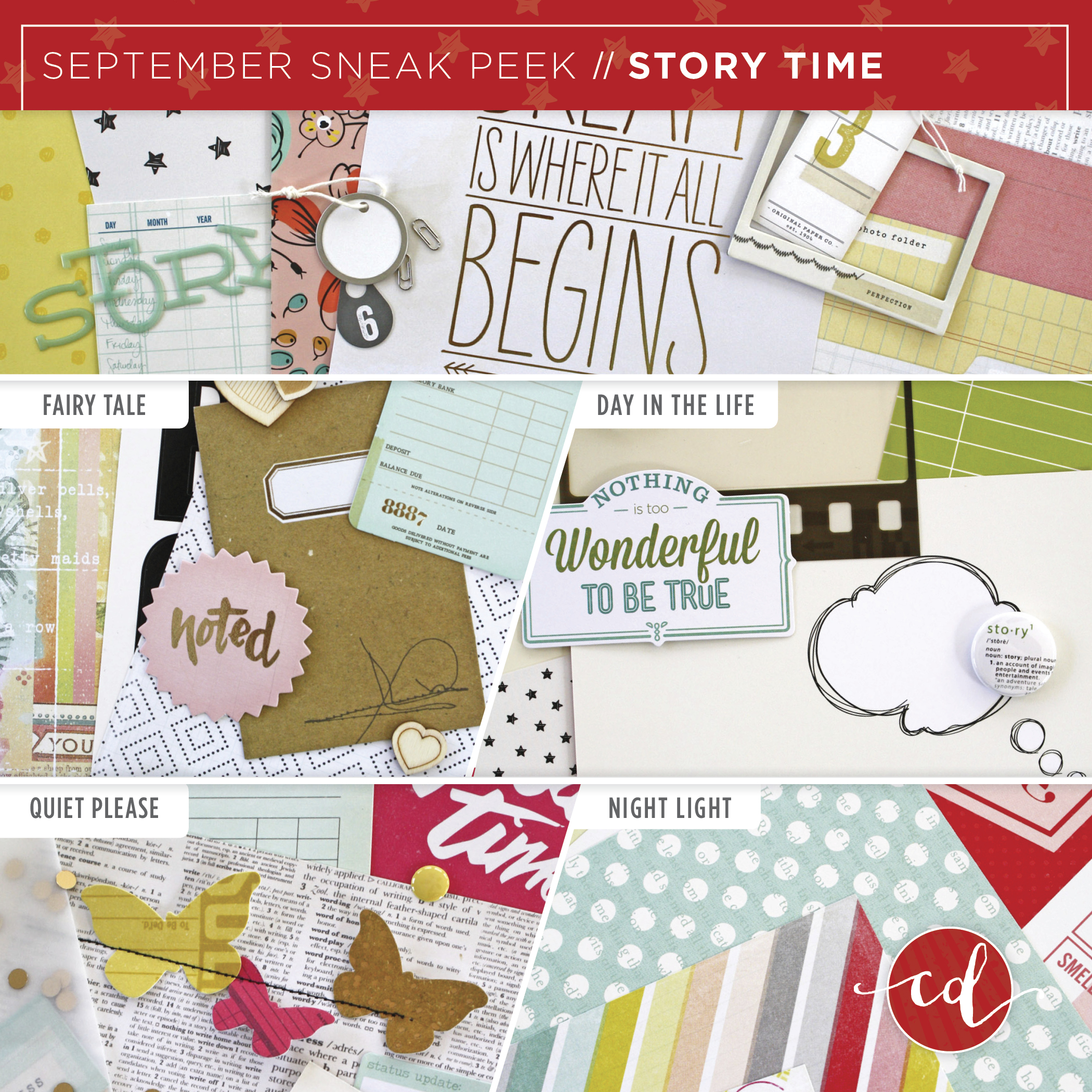 Once upon a time, it’s always the beginning to something wonderful. September is definitely a wonderful month at Cocoa Daisy. Our kit collection, Story Time is full of whimsical flowers and stars mixed with book pages, office supplies, and polka dots. Christine has curated a magical collection of papers and embellishments that will inspire you to start scrapping your own happily ever after as soon as your box hits your doorstep.