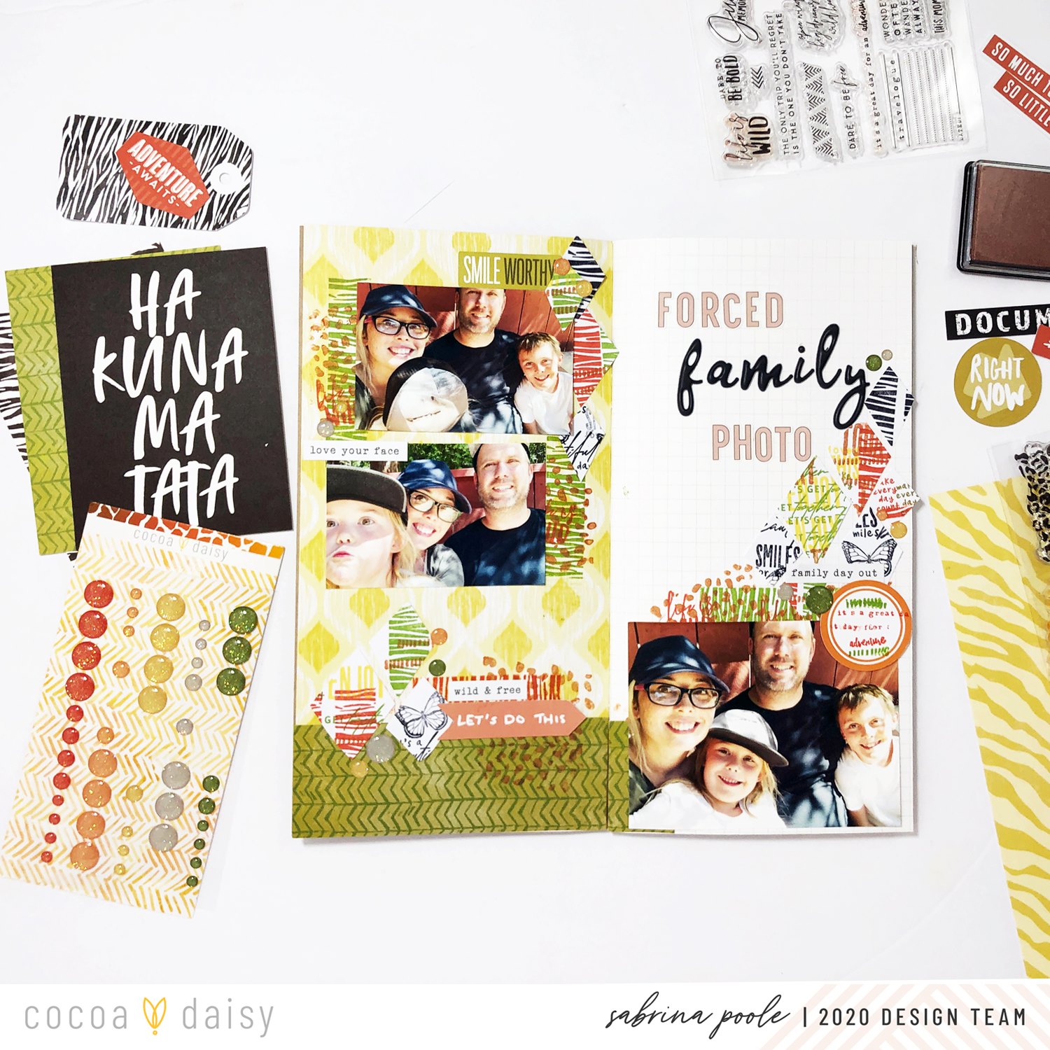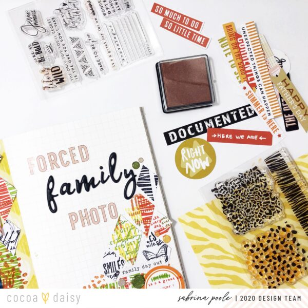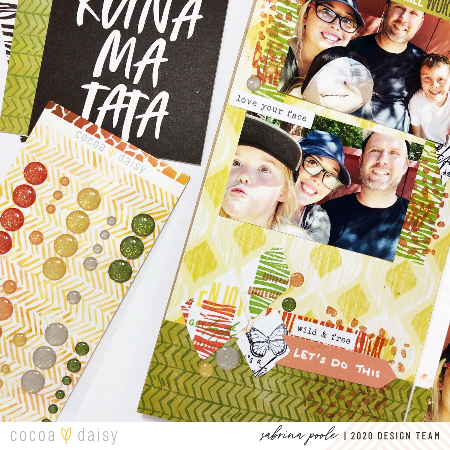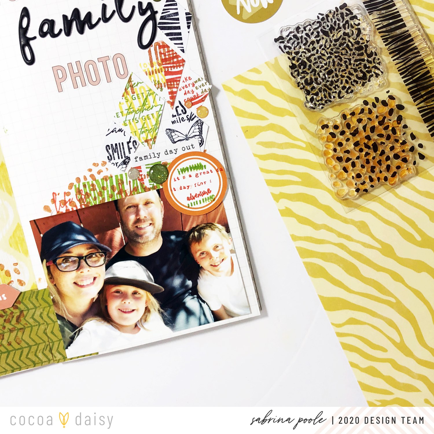 Instead of using patterned papers to back my photos or layer behind the photos, I decided to use stamps to layer behind the photos. I used the animal print stamp set in 3 different colors behind my photos. I love how it adds a pop of color and more patterns to my spread.