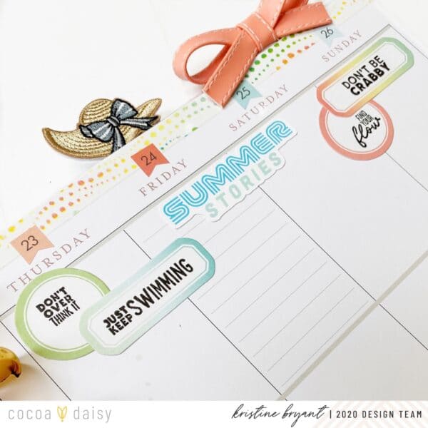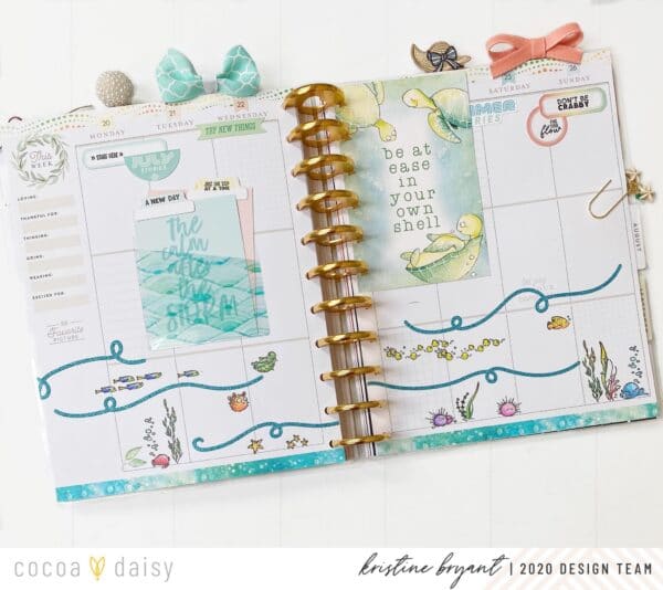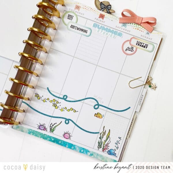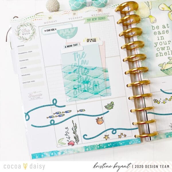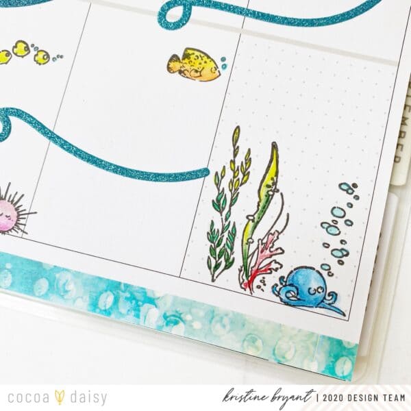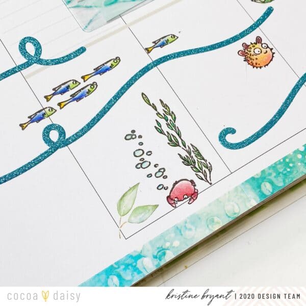 “An adorable and colorful layout will help me keep a positive attitude, and the stamps for this month are so cute! I just had to create a sea scene at the bottom of this spread, and the glitter swirl stickers from the December kits that I had stashed away make the perfect ocean waves. I had fun stamping and coloring all the little fishies and creatures!”