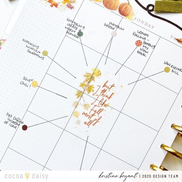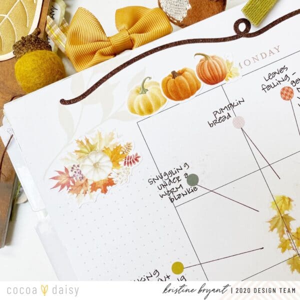 “I wanted to showcase this quote about the best things in autumn (from the Memory Keeping Sticker Kit), and I also wanted to leave plenty of space around the page to write in more entries as they come to me. So I kept the embellishments very simple – just a couple of the glitter swirls and a few pumpkin stickers.”