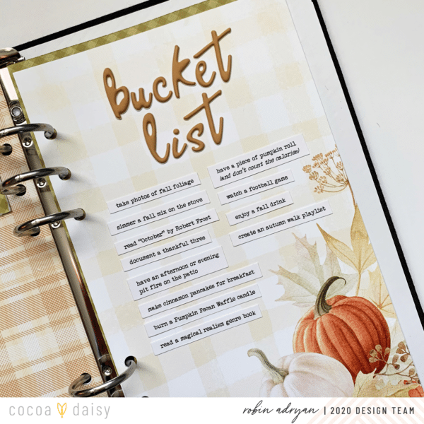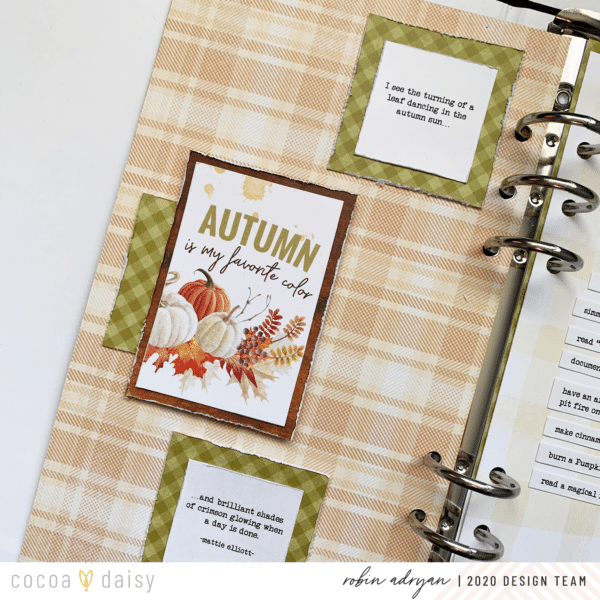 Carrying on with Kristine’s idea of keeping it simple, I am sharing my Autumn bucket list. I used a rectangle quote sticker from the memory keeping sticker kit as the focal point for the page opposite of my bucket list. I didn’t want it to compete with the list and so resisted the urge to hand stitch on the paper layers.