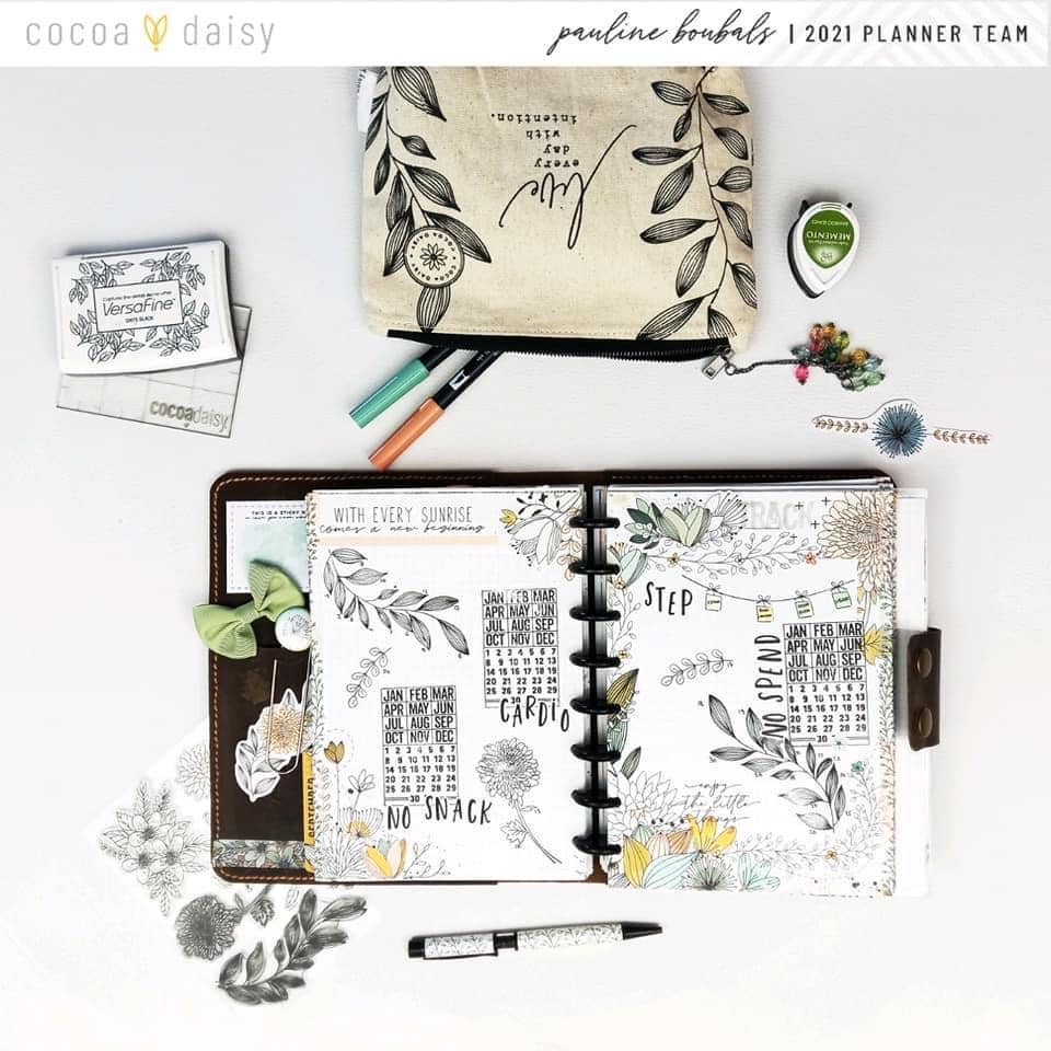 This is my other project where I love to use stamps: my tracker page! For this one, I used the Flower and Doodles Stamp Set stamps, alpha stickers, and an older calendar stamp. I use the calendar stamp for tracking no spend/no snack and cardio. I circle the day’s number in green if I did the task correctly or make a red cross if I didn’t. For my steps tracking I use more decorative stamps. I just add the day’s number, and I color the stamp depending on how many steps I did this day.