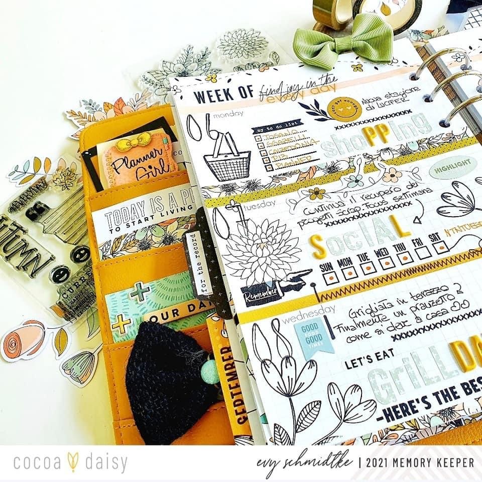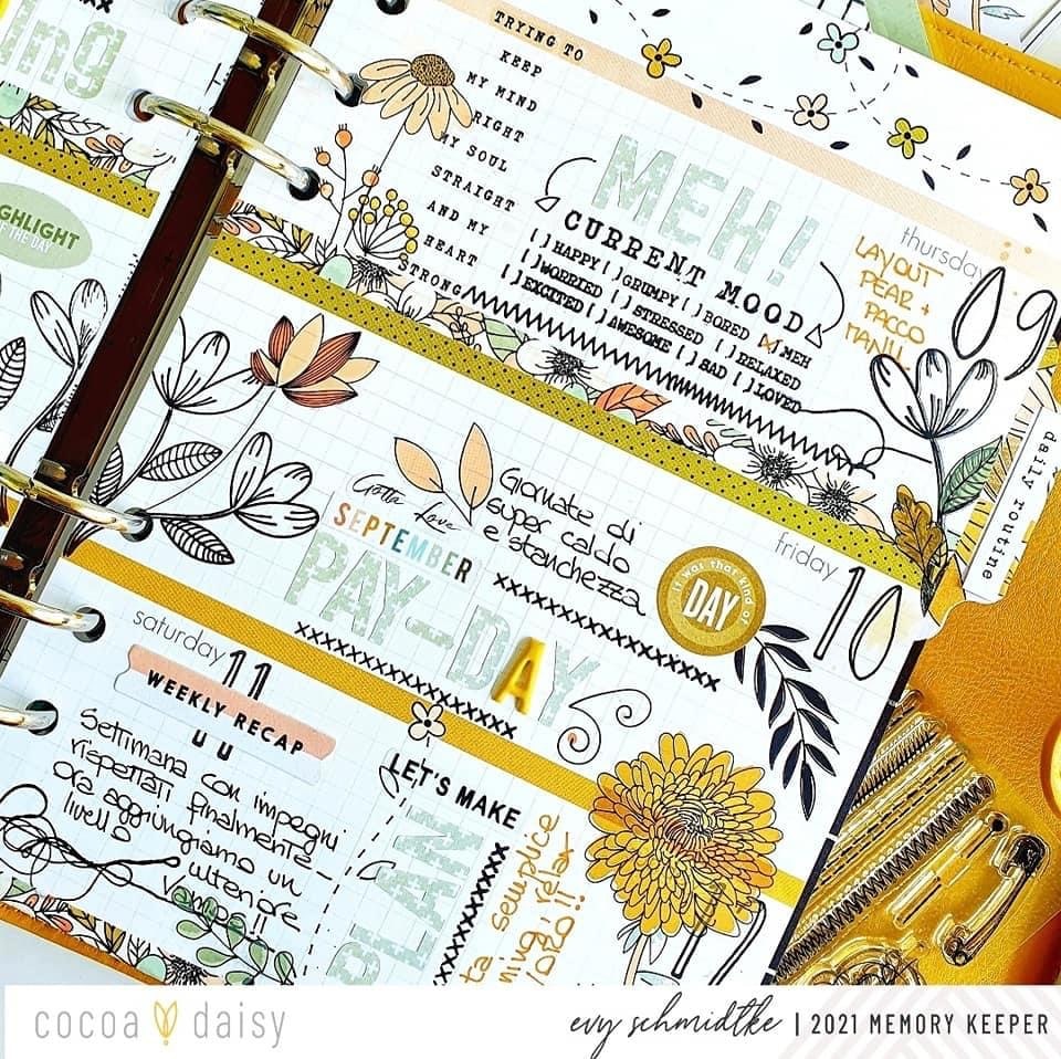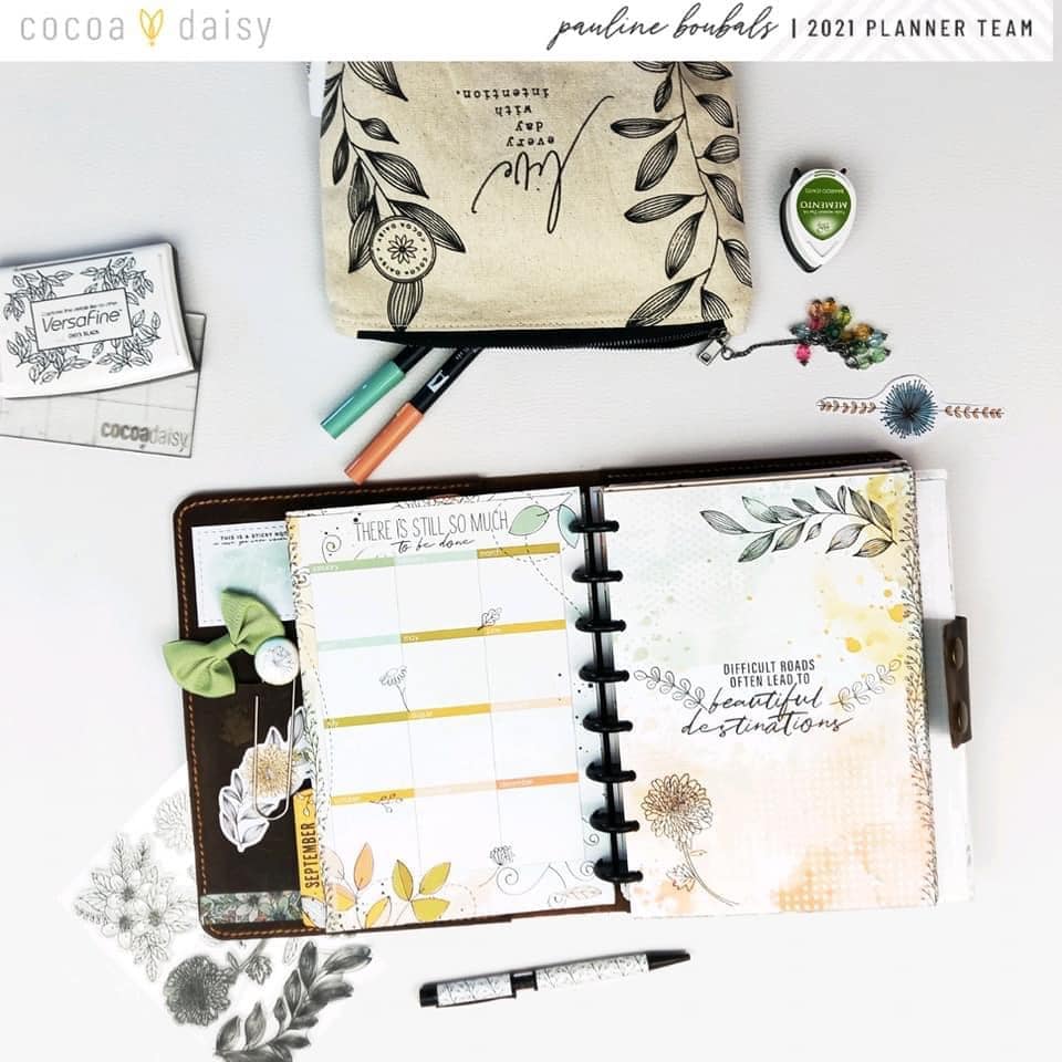 “I really loved September stamps. This set was perfect for a discrete decoration of this page from the A5 planner pages, which was already very colorful. That’s why I decided to only use black ink for my stamping. This page is my future log for the month. I also love to use stamps on my dashboards, in order to personalize them. For this one, I only added a few stamps from the Doodles & Dashes Flower and Doodles Stamp Set to my dashboard and a bit of a washi tape on the side.