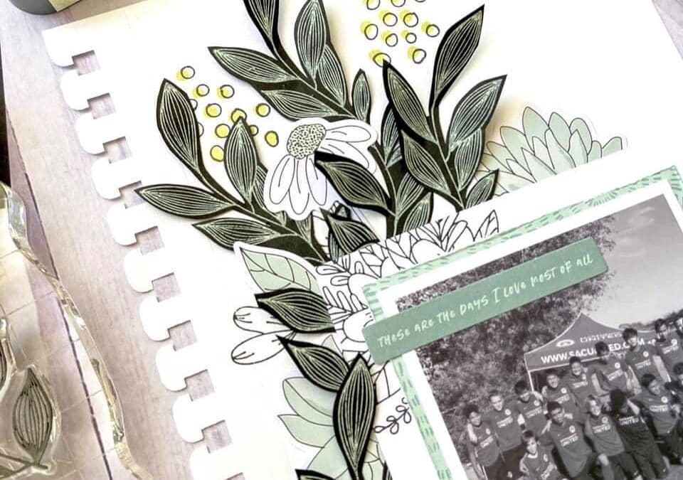 “I don’t know if I have ever loved a stamp set more than the Doodles & Dashes Flower and Doodles Stamp Set. I have used a stamp on nearly every project this month. I love their versatility and delicate design. I tried something new on this page: layered black stamped images with lightly stamped florals in the background. I love the variety of layers and textures.