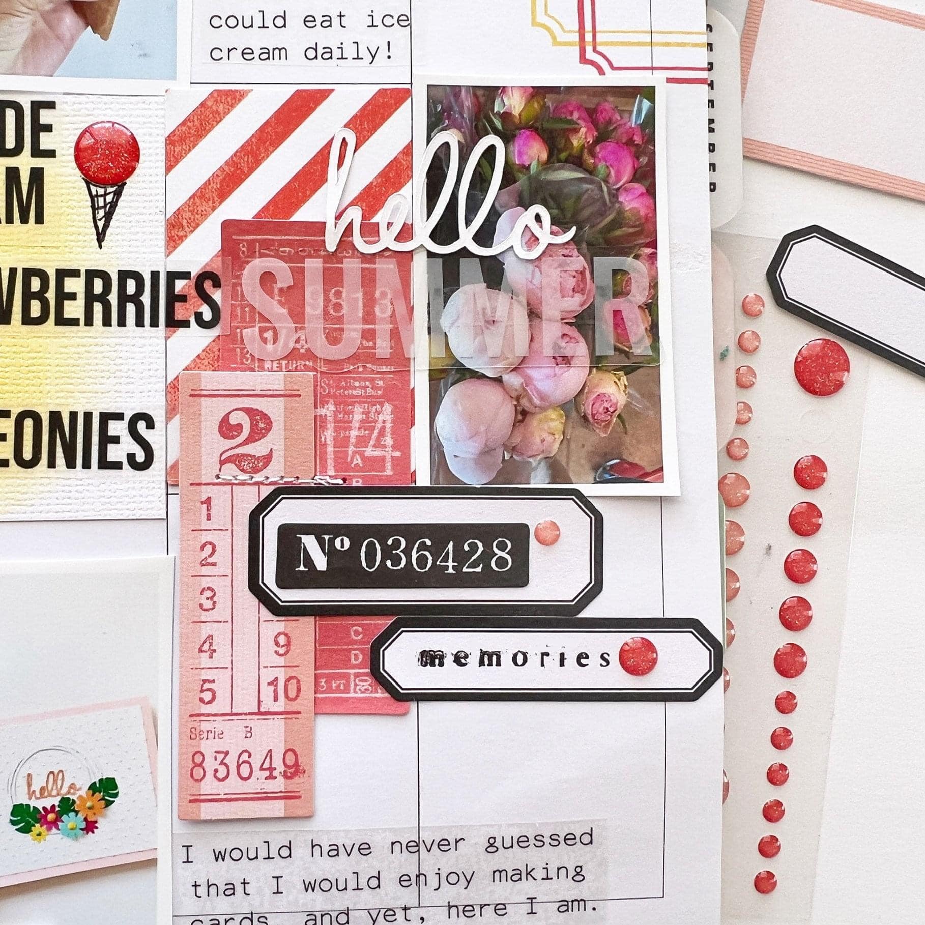 I loved the stamps in the Wayfarer Modern Memory Keeping Kit. So I stamped on the sticky post in light pink. I also used the Summer and labels stamp on the right side.