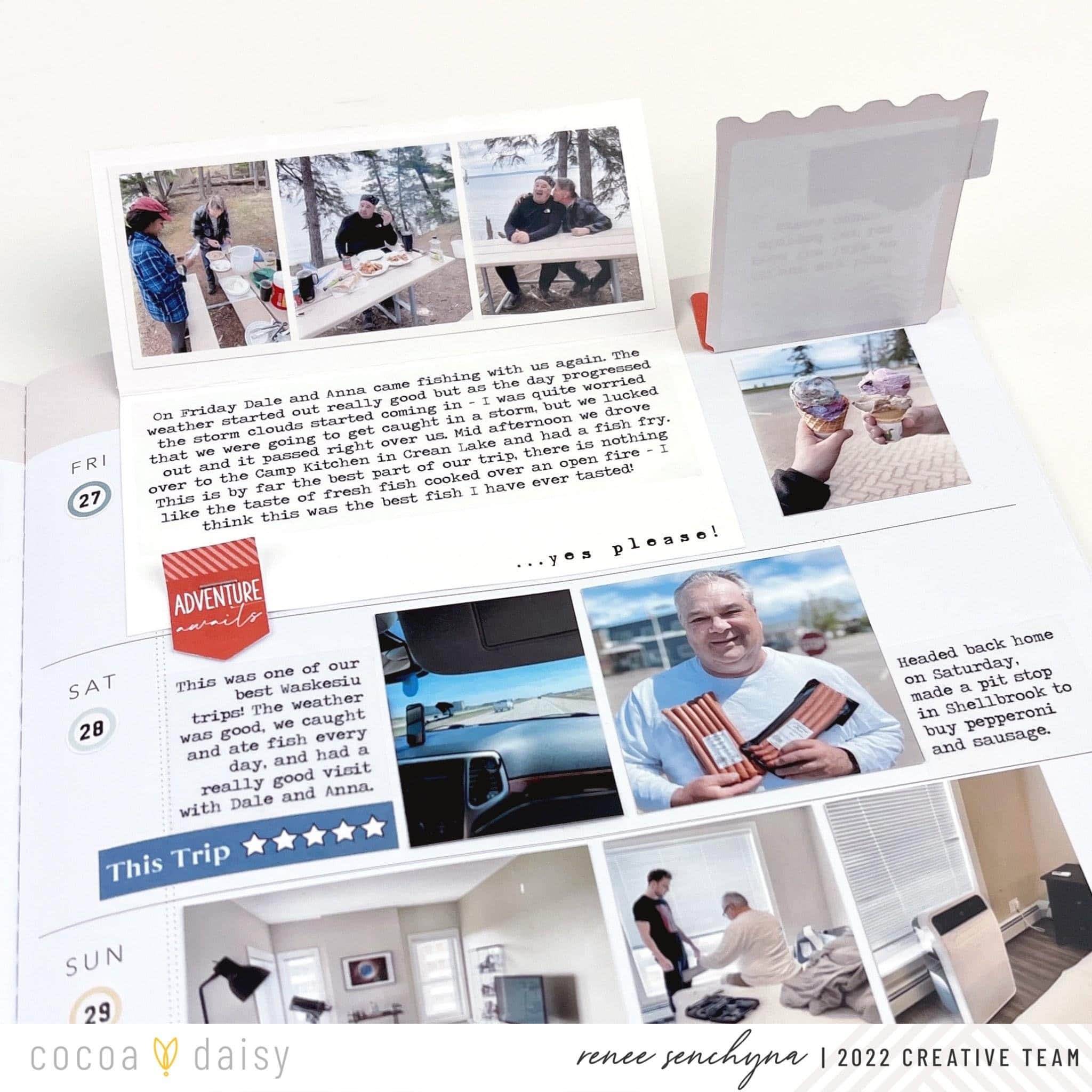 When I am adding my photos, I like to leave room for embellishments and stamping. So when I have a week that includes a lot of photos, I try to create flip-ups or pockets to add them. I have one pocket and two flip-ups for this week. I love that the interactive elements give you more room for extra photos and journaling.