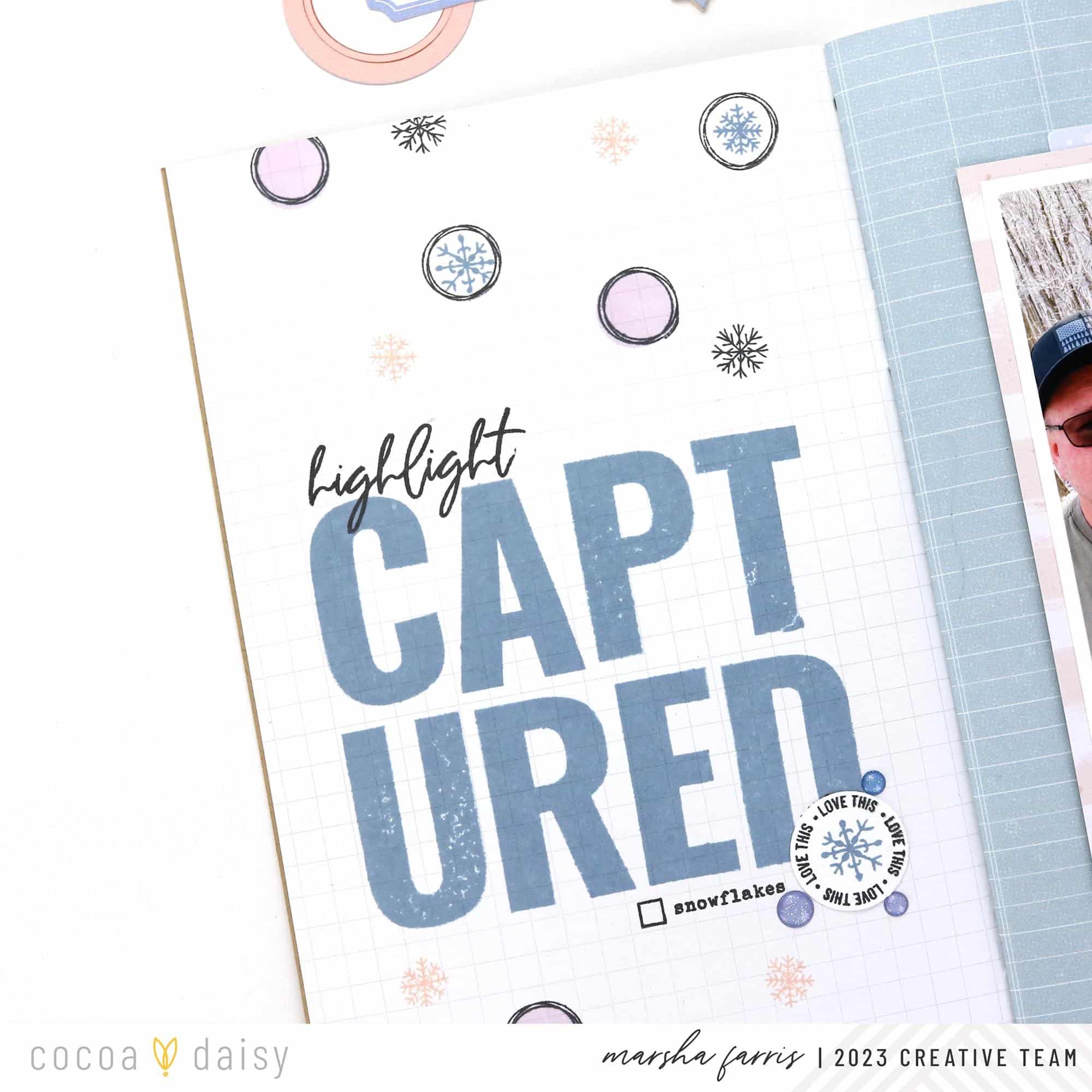 I stamped a large title with the General Store Alphabet Stamp to start the layout. It is such a great size alpha stamp for traveler’s notebook pages! I then stamped the word highlight from the Nordic Skies Memory Keeping Stamp Sets by masking the “s” from the stamp to complete the title.