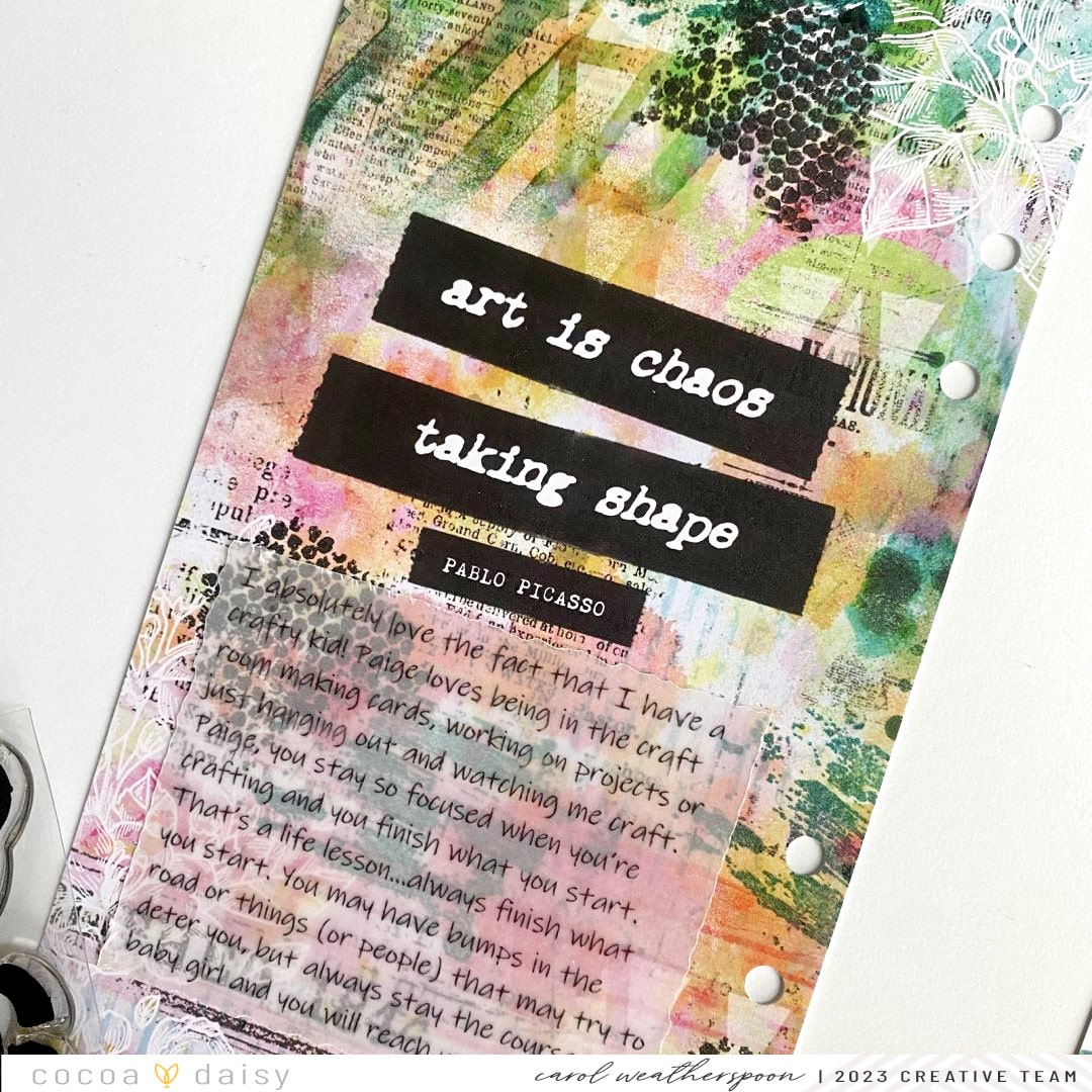 For the left side, I added a few of the mixed media stamps which blended beautifully into this “Art is Chaos” background. I also added my journaling to this page. It’s a tad difficult to read with all the goodness going on underneath the vellum, but that’s exactly what I wanted. Now, let’s talk about the right side, shall we?