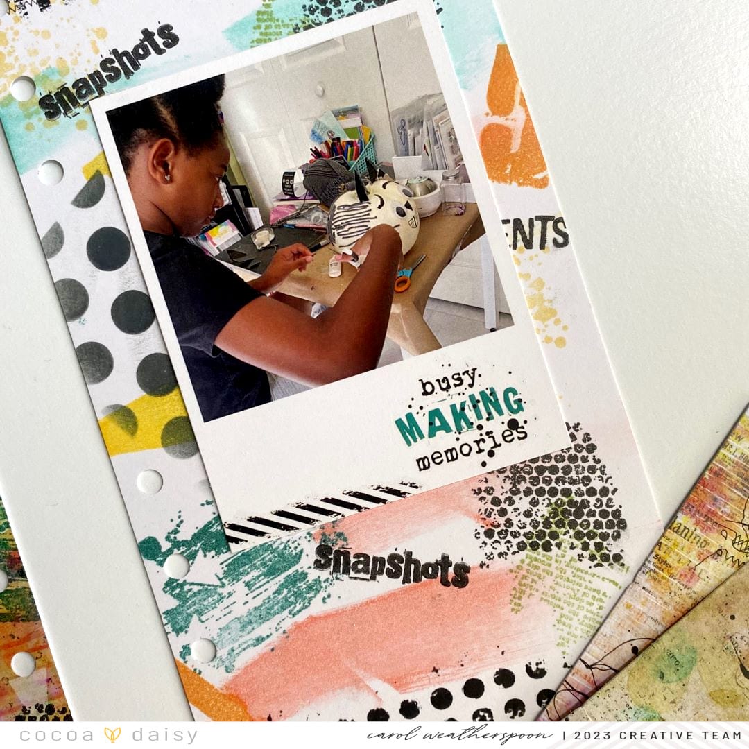 I love stamping and the stamps in the Daily Journal Collection are amazing! They exude mixed media and whether you like to get your hands inky or not, these stamps will make it so fun to add different designs and textures to your spread! Let’s talk about this layout. On the left side, the patterned paper did a lot of the work, but on the right side, that’s all me! (Of course with the exception of the title and polka dots along the bottom) I added a lot of stamping to the right side, but we’ll get to that in just a moment.