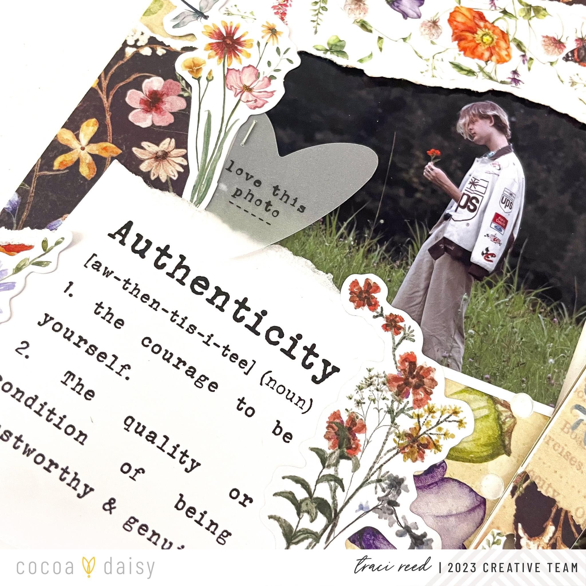 Now, it was time to showcase the star of the page—the photos. I chose to have each and every photo either “falling” off the edge of the page or tucked in between cards and torn papers to give it a more natural flow. The “authenticity” card included in the Quiet Meadow Modern Memory Keeping Kit was the perfect touch for this page.