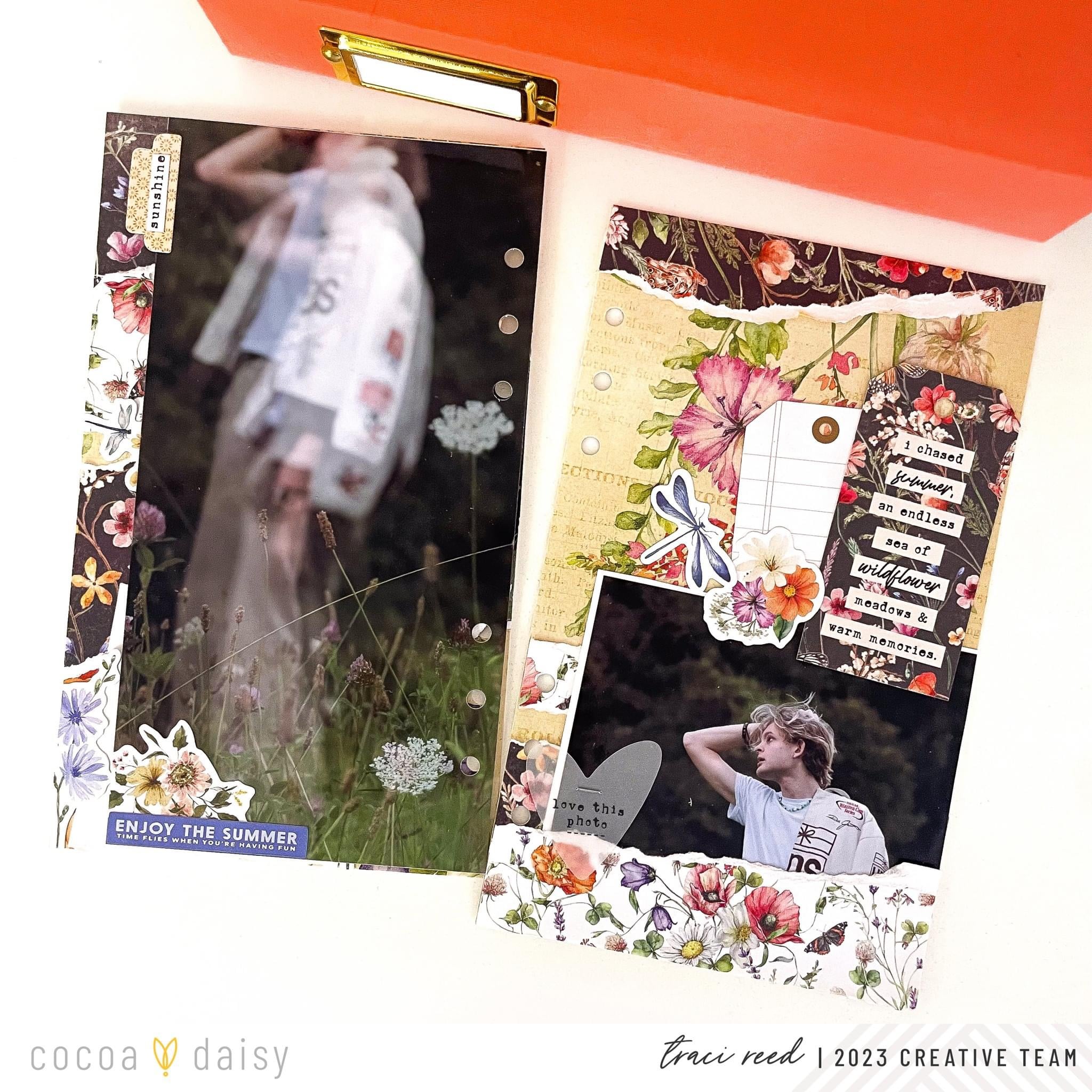 I’m ALL about contrast when it comes to designing scrapbook pages, so when I saw there were beautiful black and white floral papers in the Quiet Meadow Traveler’s Notebook Memory Keeping Kit, I knew they would match perfectly with photos of my son dressed in black and white standing in a field of wildflowers!
