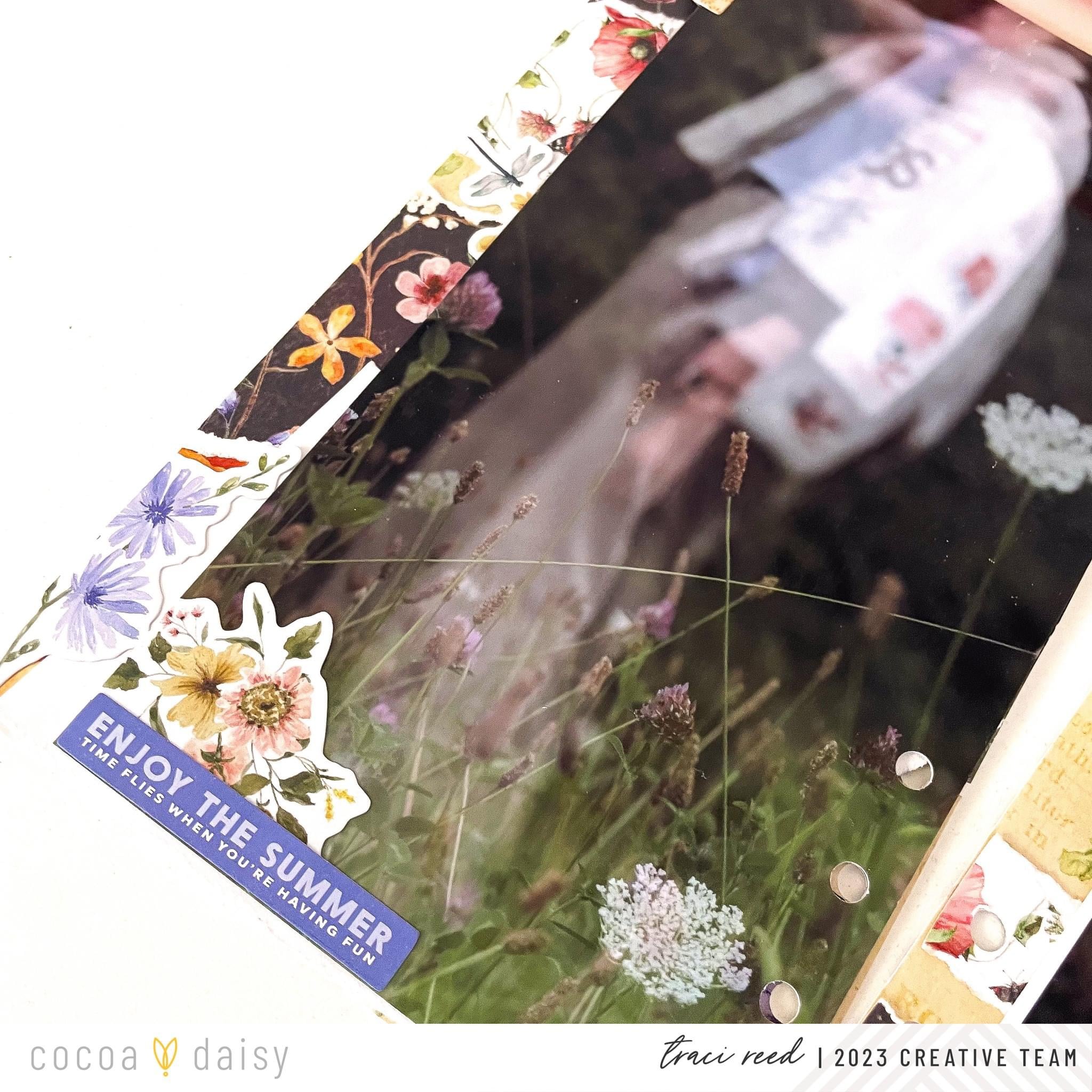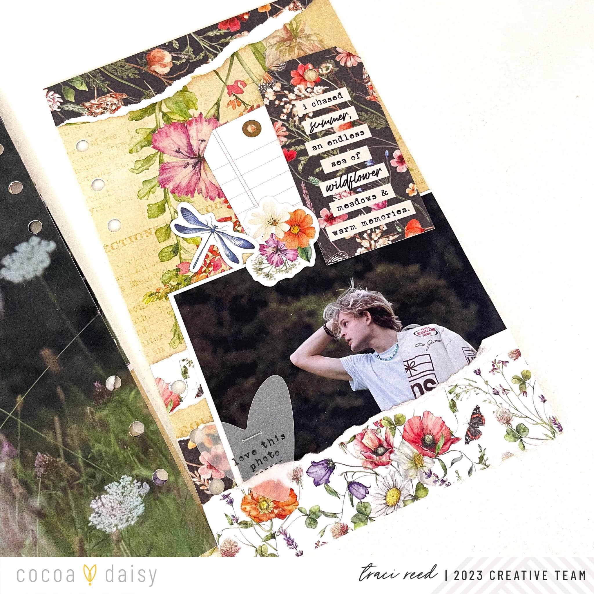 The Quiet Meadow Modern Memory Keeping Kit came with delightful ephemera, featuring botanical motifs that perfectly complemented my torn paper collage-style scrapbook page. I carefully selected ephemera pieces that accentuated the wildflower theme or added a touch of sentimentality to the page. Butterflies, vellum hearts, and rub-on titles found their place strategically around the photos and torn paper, maintaining a harmonious flow.