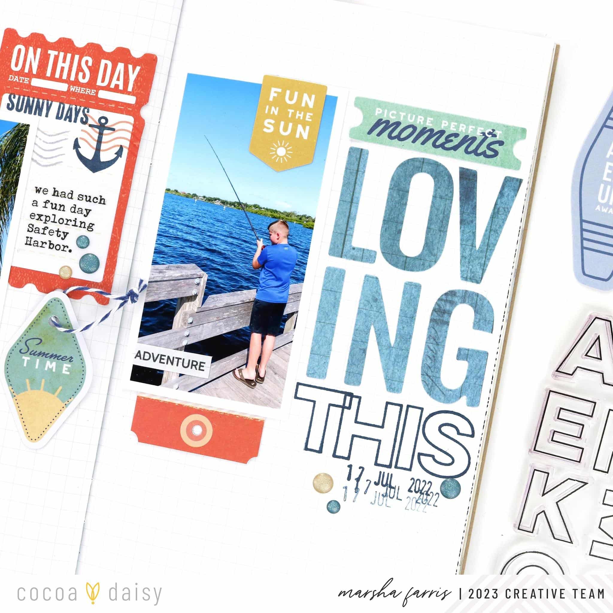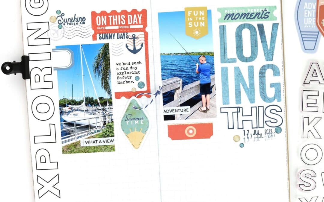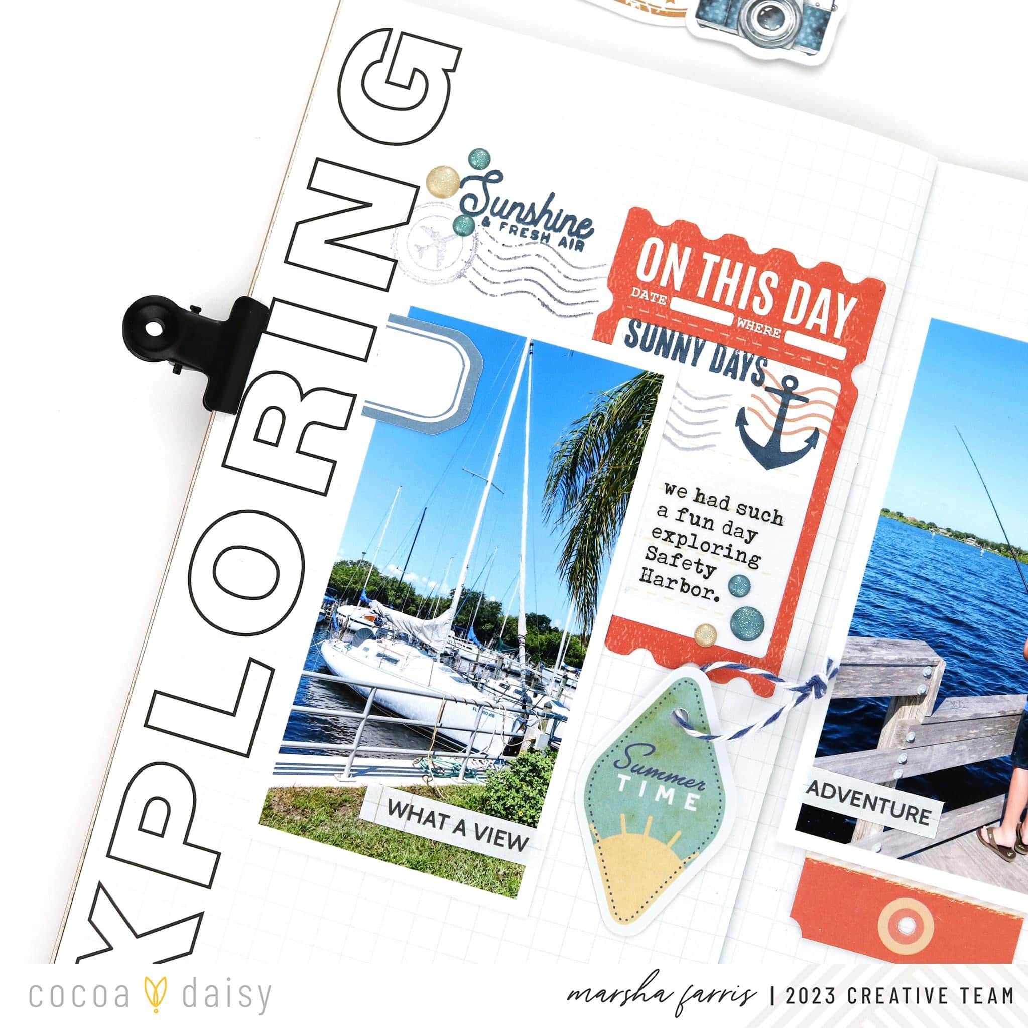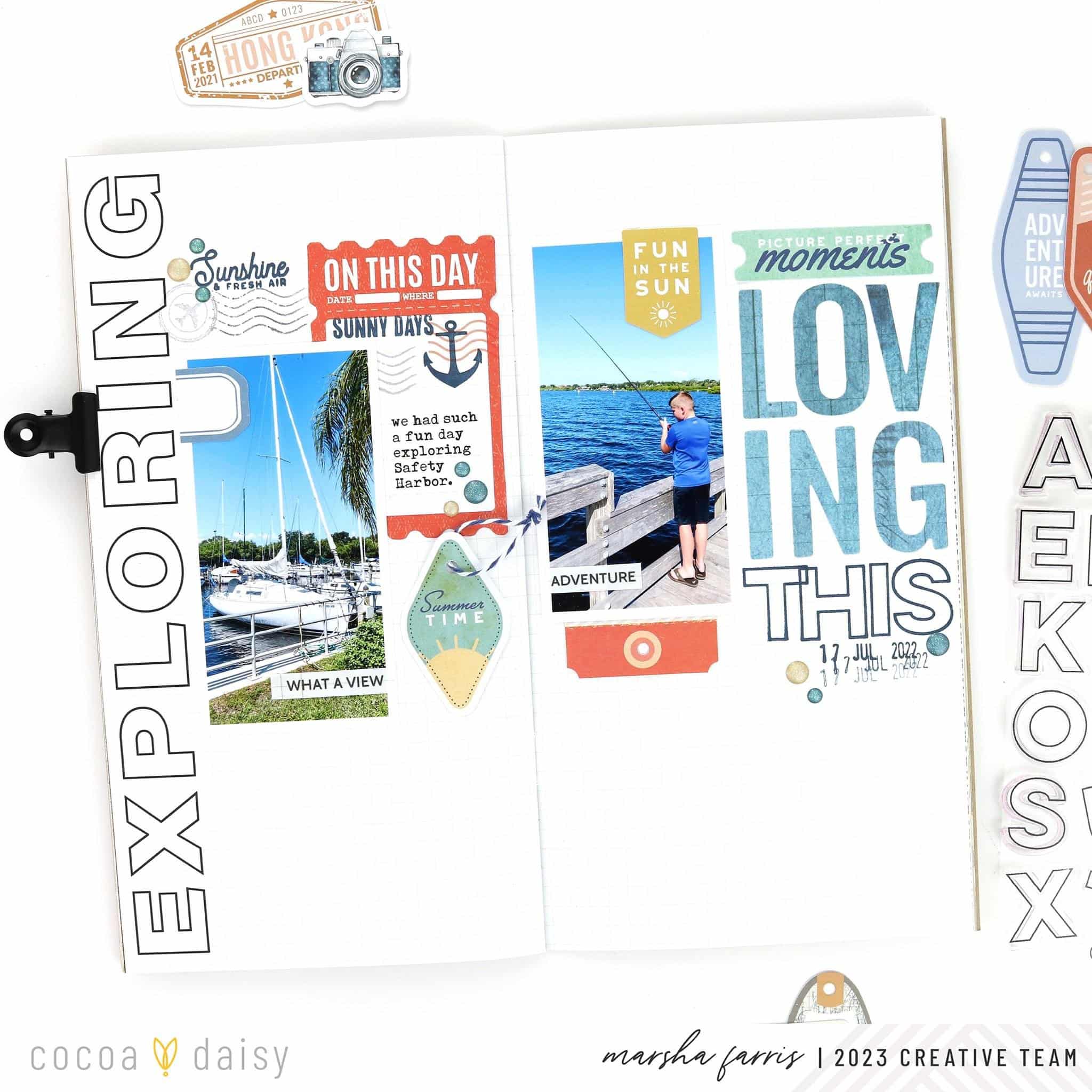 To begin the layout, I selected a spread in the Wander Simple Dori to use as a base for my design. I loved the bold “Exploring” word along the edge of the page and thought it was perfect for my project documenting a family vacation day. I chose a die-cut tag and a journaling sticky note from the Wayfarer Modern Memory Keeping Kit to use on the layout. I arranged my photos and added some stamping with the stamps from the Wander Traveler’s Notebook Memory Keeping Kit and Wayfarer Traveler’s Notebook Memory Keeping Kit with gray and navy ink. The stamps worked so well layered together!
