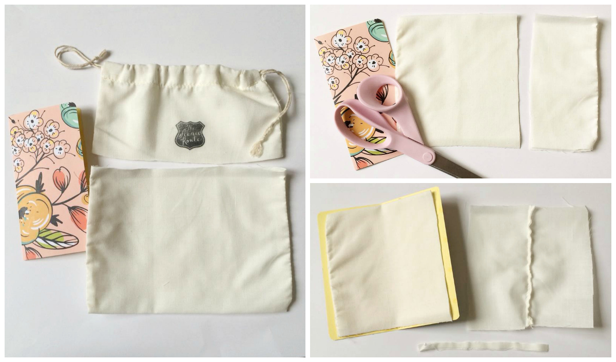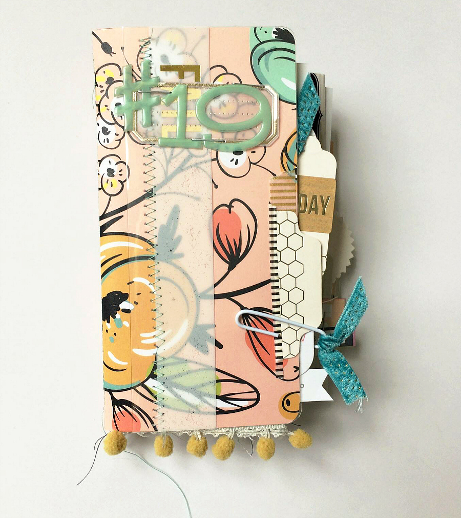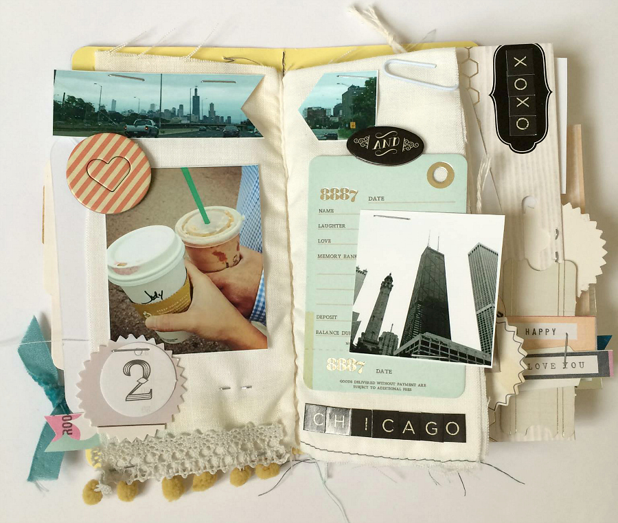 I found that using fabric for pages was a little bit tricky. I love the texture so much and it just adds a cool element to a tiny book like this. Some of the techniques I used for attaching photos and trims and other details were: machine stitching, stapling, Therm-o-web super adhesive strips and fabric glue. The packaging of some of the products made for sweet tags in this book too. This is the kind of project where it works well to just play around and use up bits and pieces of all sorts of things. Ribbons and pom-pom trim and stamps and washi tape all add fun details and texture to the pages.