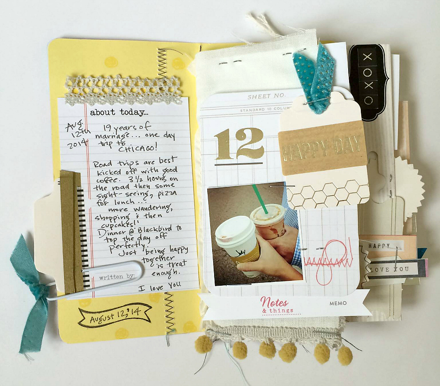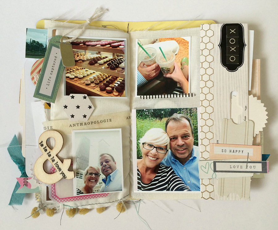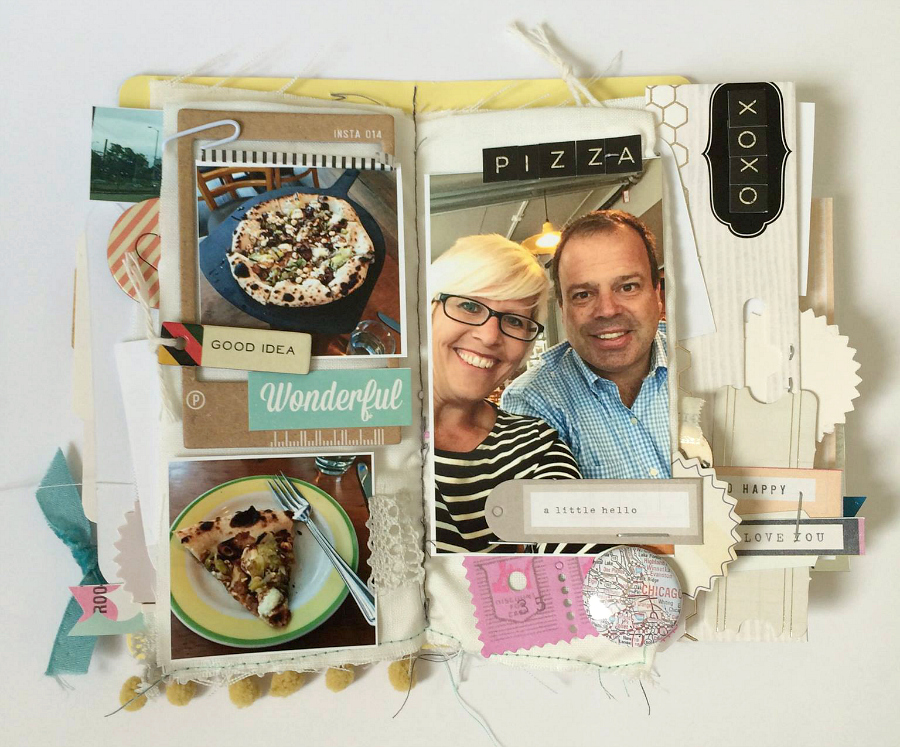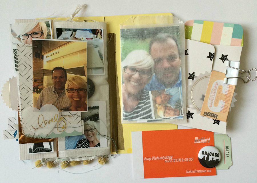 Next came the fun part…filling up those blank pages! I had so many photos from a single day-trip to Chicago that my husband and I went on for our 19th anniversary, so I made mini collages with the pictures at picmonkey.com. If you size the background at 800 x 1200 you can then save your collage(s) as jpegs and print them as 4×6 photos wherever you like to print your photos. I just uploaded mine to my local Walgreens one-hour service because I wanted my pictures fast. They were a pretty good quality for 19 cents a print, I believe. I printed 4 or more photos on each print, so it turned out pretty cheap and fun to have various sizes of tiny pictures. So that’s one handy tip for you!
