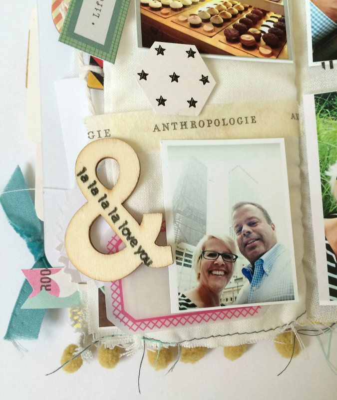 I found that a few of my photos were too large for the width of the page. You’ll see I cut one into the shape of an arrow and used it across both pages and it makes a fun element all it’s own. You would think I planned it out like that all along, right?! =) Other pictures and elements I simply left to hang over the ‘edge’ and figured it would just add a bit of bulk to the design. I love that the pages aren’t perfect in this…and yet they absolutely are because of that! Does that even make sense?! =)