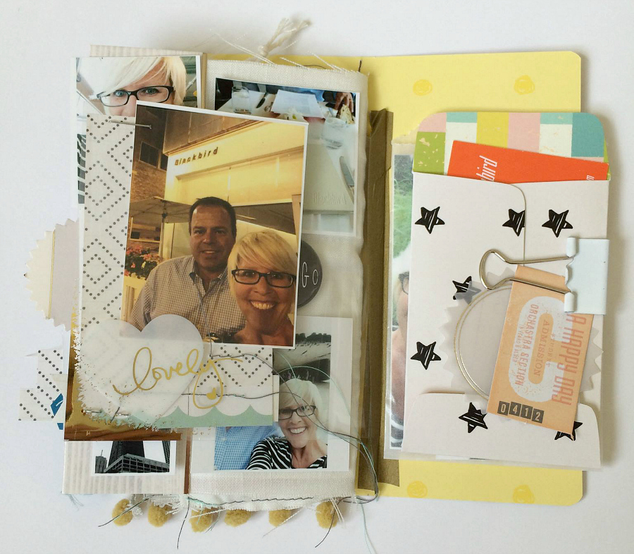 I got to the final cloth page and realized I had more photos and things I wanted to share. So I put my thinking cap on and made a flip-out page by taping a piece of acetate to the back cover with washi tape. I then clipped a glassine envelope to the back that holds extra photos. I also made a tiny envelope with the exclusive star paper that I loved so much too. That holds extra bits like a receipt, business card from the place where we enjoyed some fine dining, and our parking ramp ticket.
