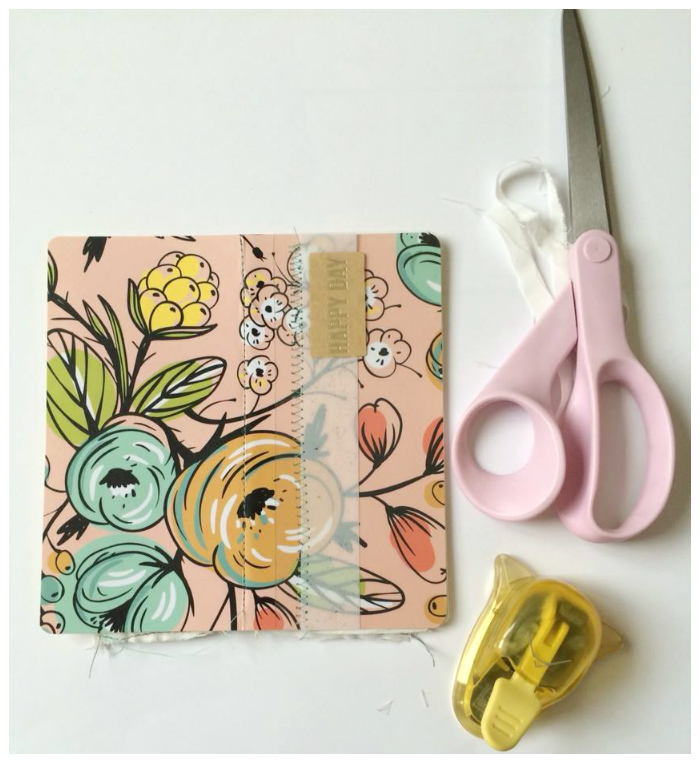 I am very carefree when it comes to my process, so nothing is ever measured or done precisely or with straight lines. I simply eyeball and cut and I folded the cloth into thirds til they seemed to be about the same size. I knew I wanted this mini to have lots of ‘feel’ to it, so I left some of the edges ‘raw’ and a couple of them I stitched across the bottom so that they were single pages. This is the kind of project to just go to town on and see what happens! I bet you will love the results you end up with too! If you cut something ‘wrong’ or something doesn’t line up just right, well to me that is always a chance to find a way to improvise or ‘cover your error’. It’s part of the fun I think! Once the pages were stitched I ran a single straight stitch through the center of them and the paper cover. Then I added a transparency to the front as well with a zig-zag stitch. A little corner punch and this is what it looked like so far…