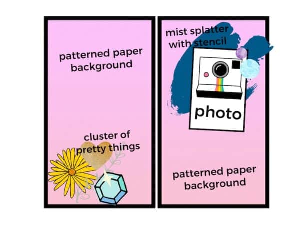 This was a simple layout made even simpler with a sketch. The big thing to figure out when you sit down to plan out a layout is what’s the most important thing to you on the page. That thing is always a great place to start. For me, it was the mist sprayed on the splatter template from one of the Memory Keeping kits this month. It ended up being pretty subtle on the page but was still a great starting point.