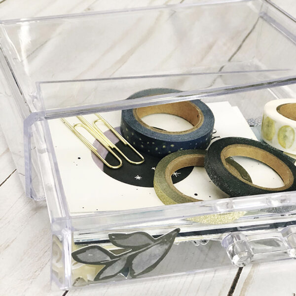 Also in the basket, I keep this cute acrylic 4×8 drawer from the bathroom/makeup organization section at Target. It houses all of my “loose” items. On top is usually the washi rolls, paperclips, and anything that’s a bit on the chunky side.