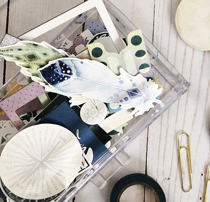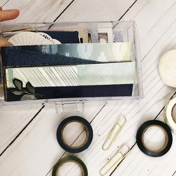 I don’t like keeping my kits in the bags they come in, and I mix all my kits together so that I can pull from them all while scrapping, so I needed a way to keep them visual and organized. I found a solution for me that involves 1 basket, 1 acrylic makeup drawer and the paper clips that come with every CD planner kit – easy peasy!