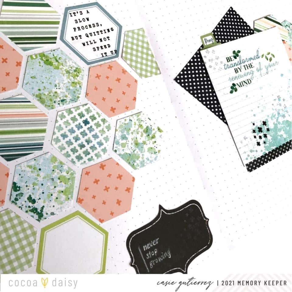 And on the right side, pops of black make the scripture journal card stand out. I finished it off with a few stamping details in black and silver.” We love how Casie’s scripture sticker from the Tranquility Bible Journaling Kit pops next to the colorful hexagons.