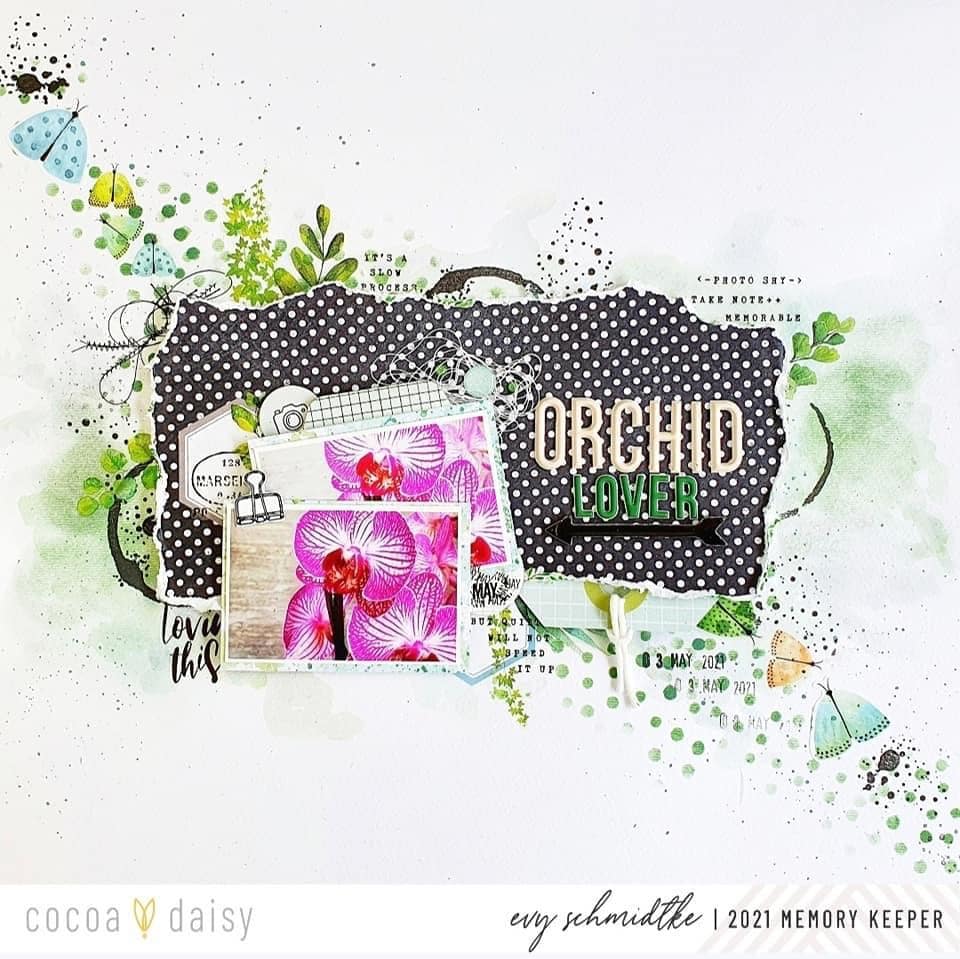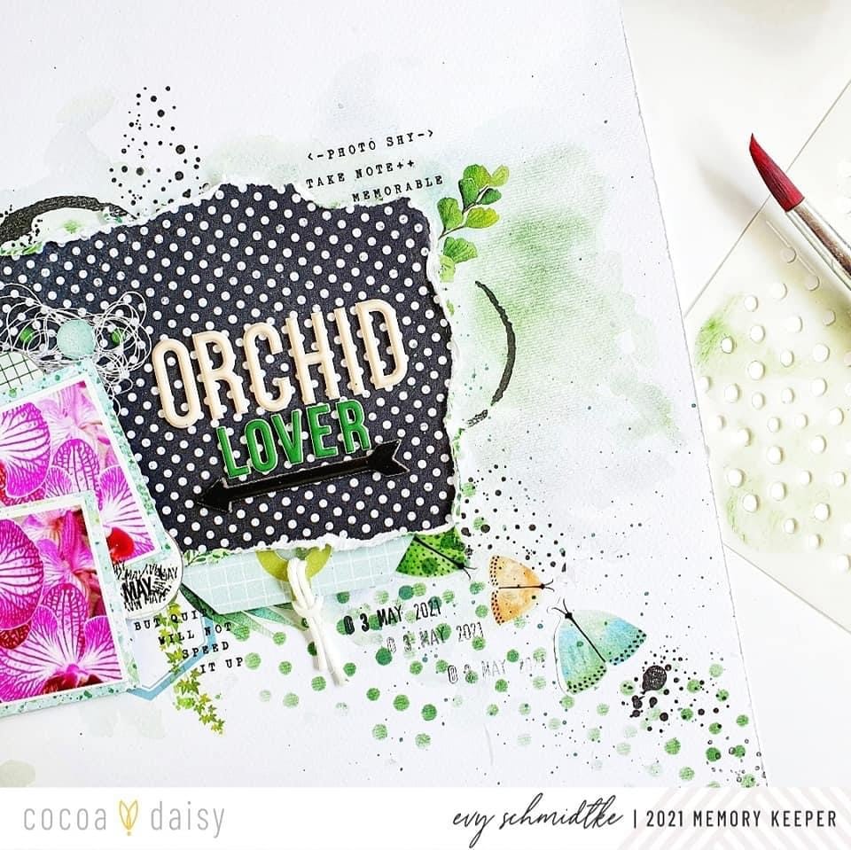 “Hi there Cocoa Daisies! Do you ever find yourself returning to a certain treatment or color on your pages? That’s me and black! I can never get away from it — whether it’s black splatter or embellishments I just find that pops of black give so much depth and emotion to a page.