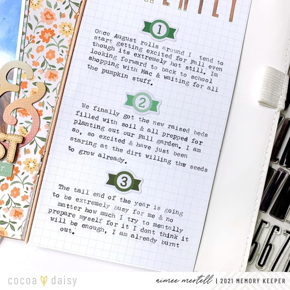 For the opposite side of the Peach Ridge Simple Dori, I selected a grid paper and used the Cocoa Daisy Alpha Stamp Set to stamp out “currently” at the top of the page in coordinating colors. Next, I adhered these cute numbered adhesive die cuts down the center. Underneath each, I just journaled about my three things.