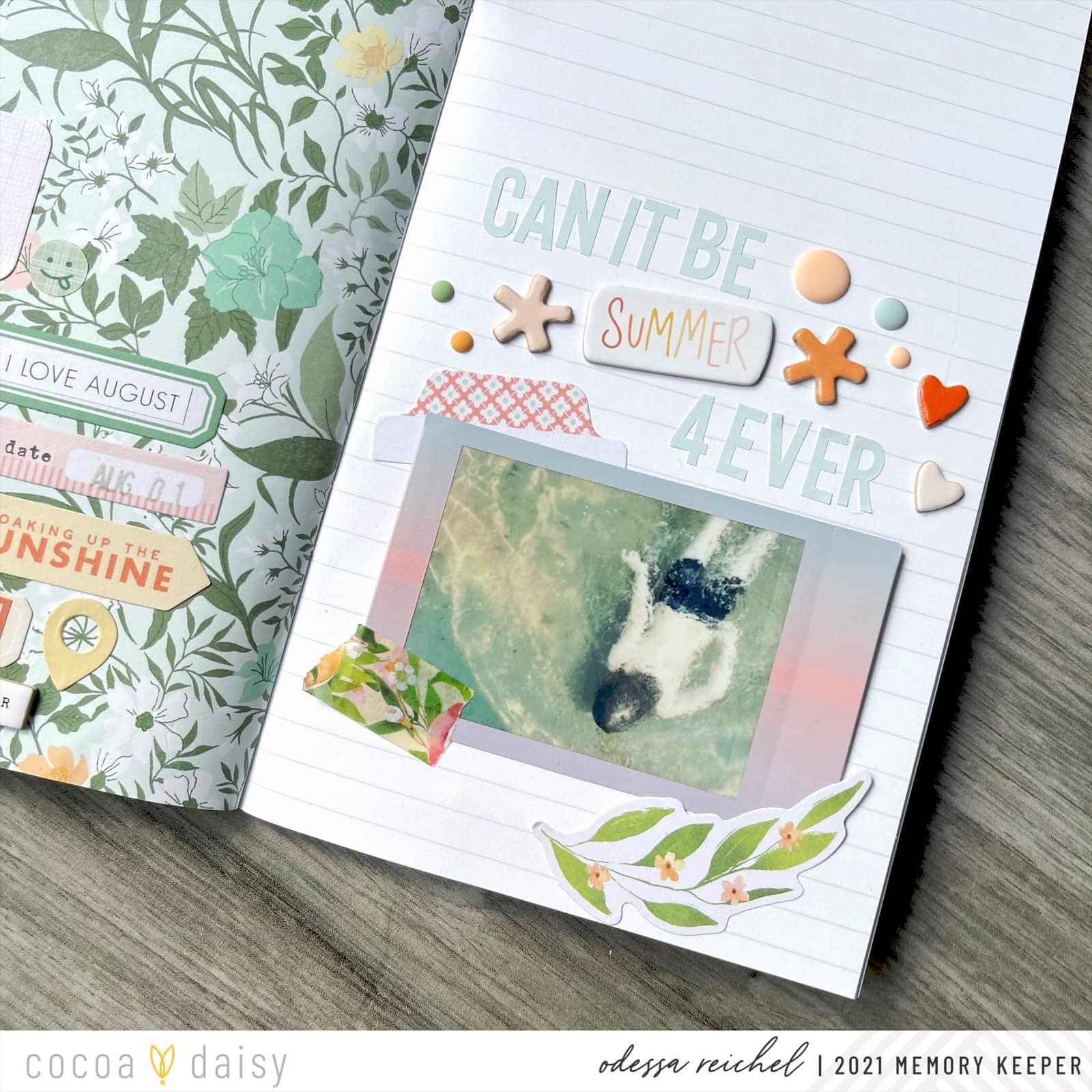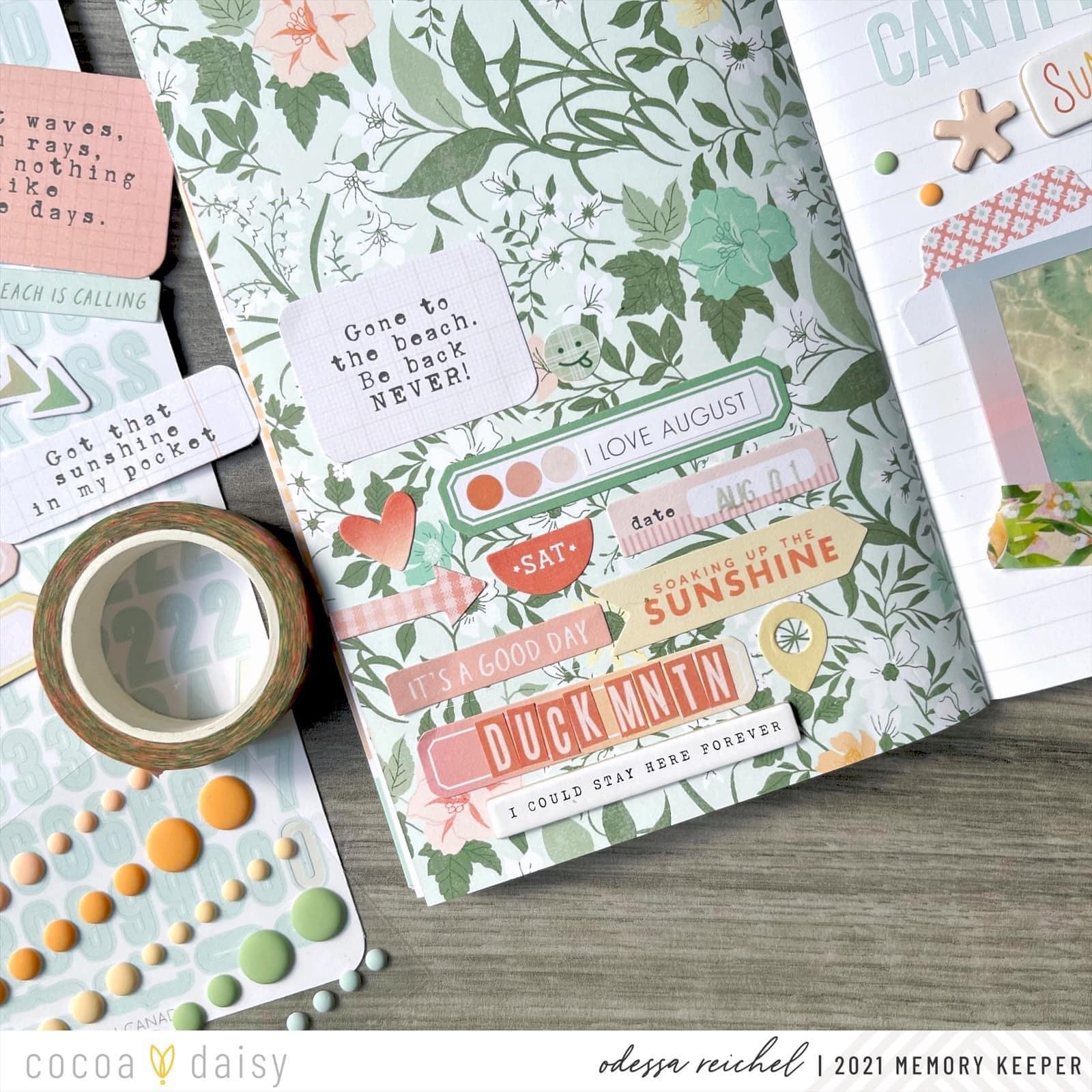 I chose to put my photo on the patterned side and thought the August wood veneer piece from the Peach Ridge Modern Memory Keeping Kit was the perfect embellishment for this particular page. I just love when I am able to use up my wood veneer pieces. Next, I included some fun die cuts from the Peach Ridge Travelers Notebook Memory Keeping Kit for some added flair!