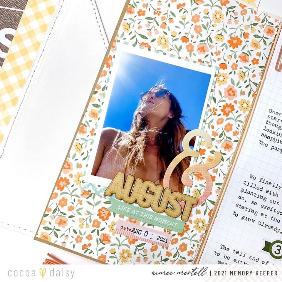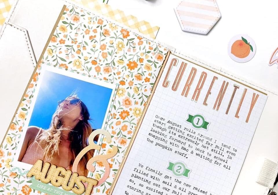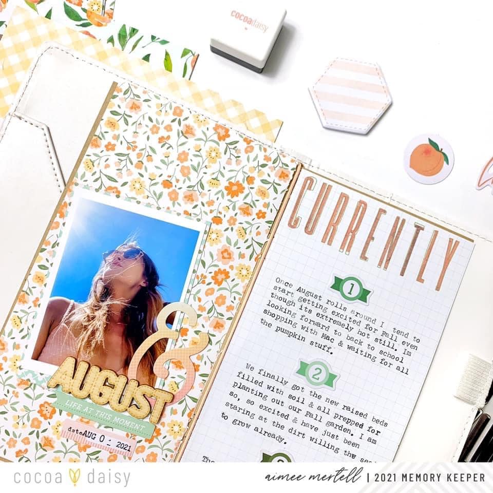 Happy Simple Dori Saturday Daisies! It’s Aimee here today with a “currently” layout for August— of course using the new Peach Ridge Collection. It just so happens that I snapped this selfie on August 1st and I thought it would be fun to make a spread about three things going on in my life as we were entering a new month.