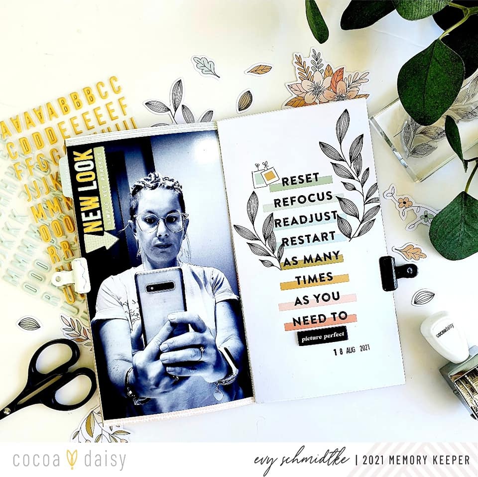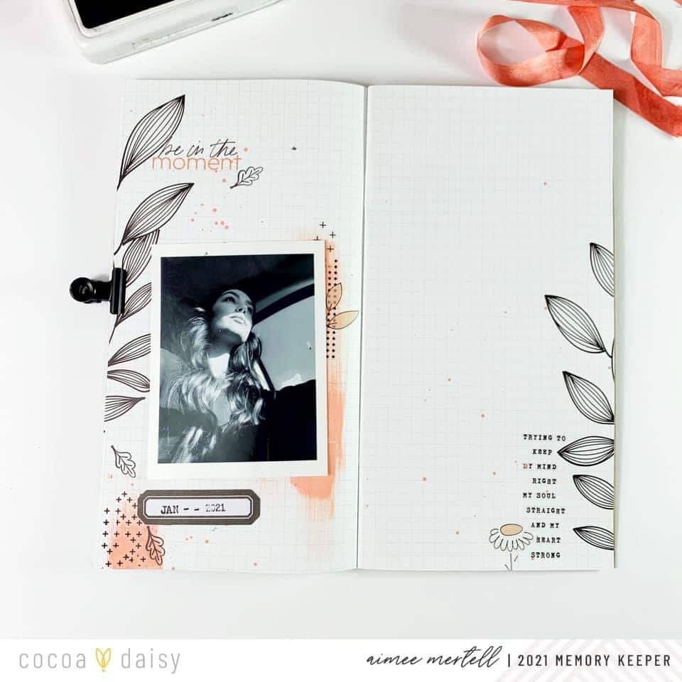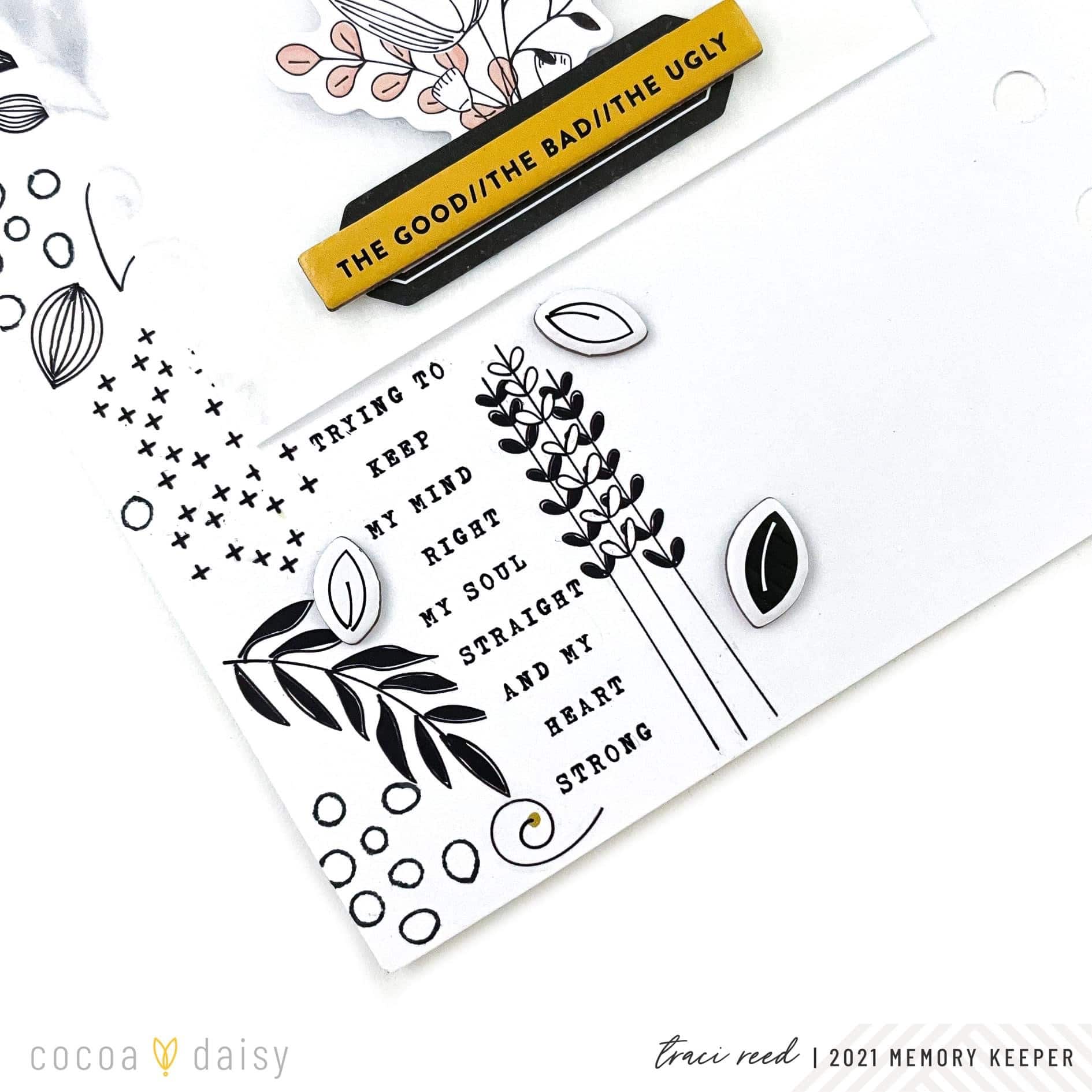 I chose a beautiful black leaf patterned paper from the Simple Dori in the Doodles and Dashes Traveler’s Notebook Memory Keeping Kit to serve as a base for my layout.