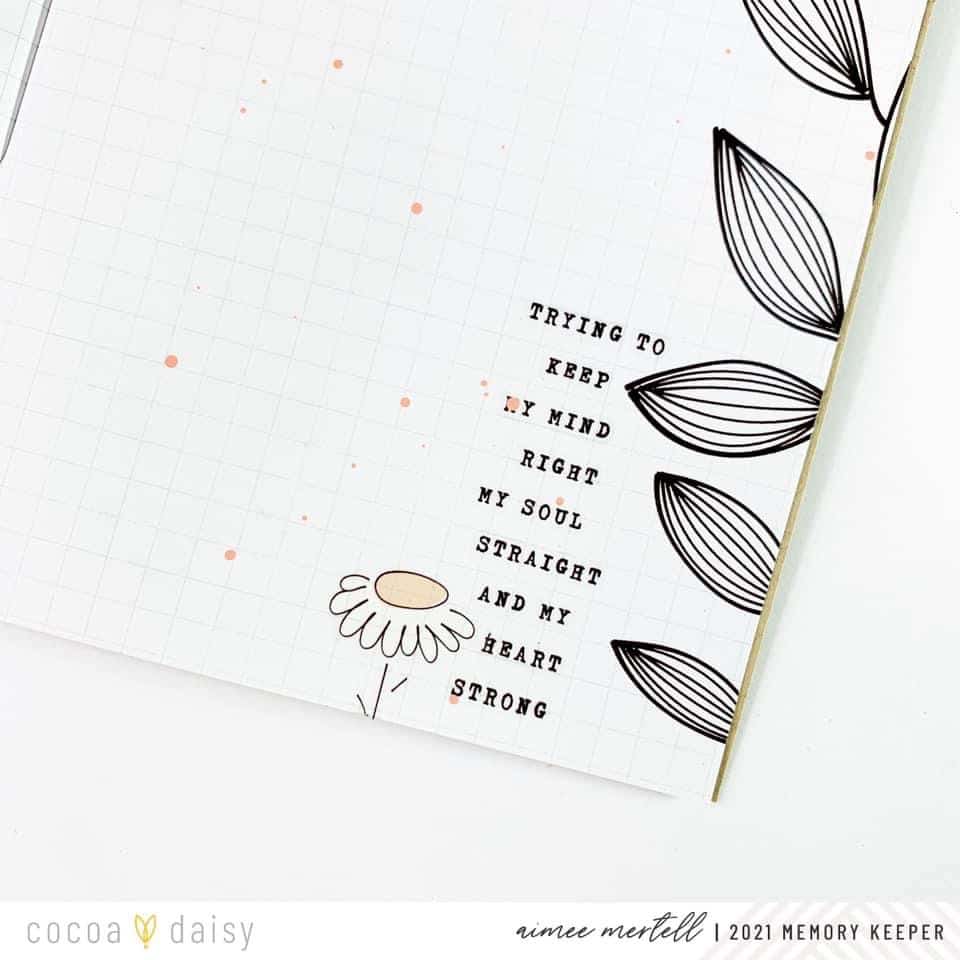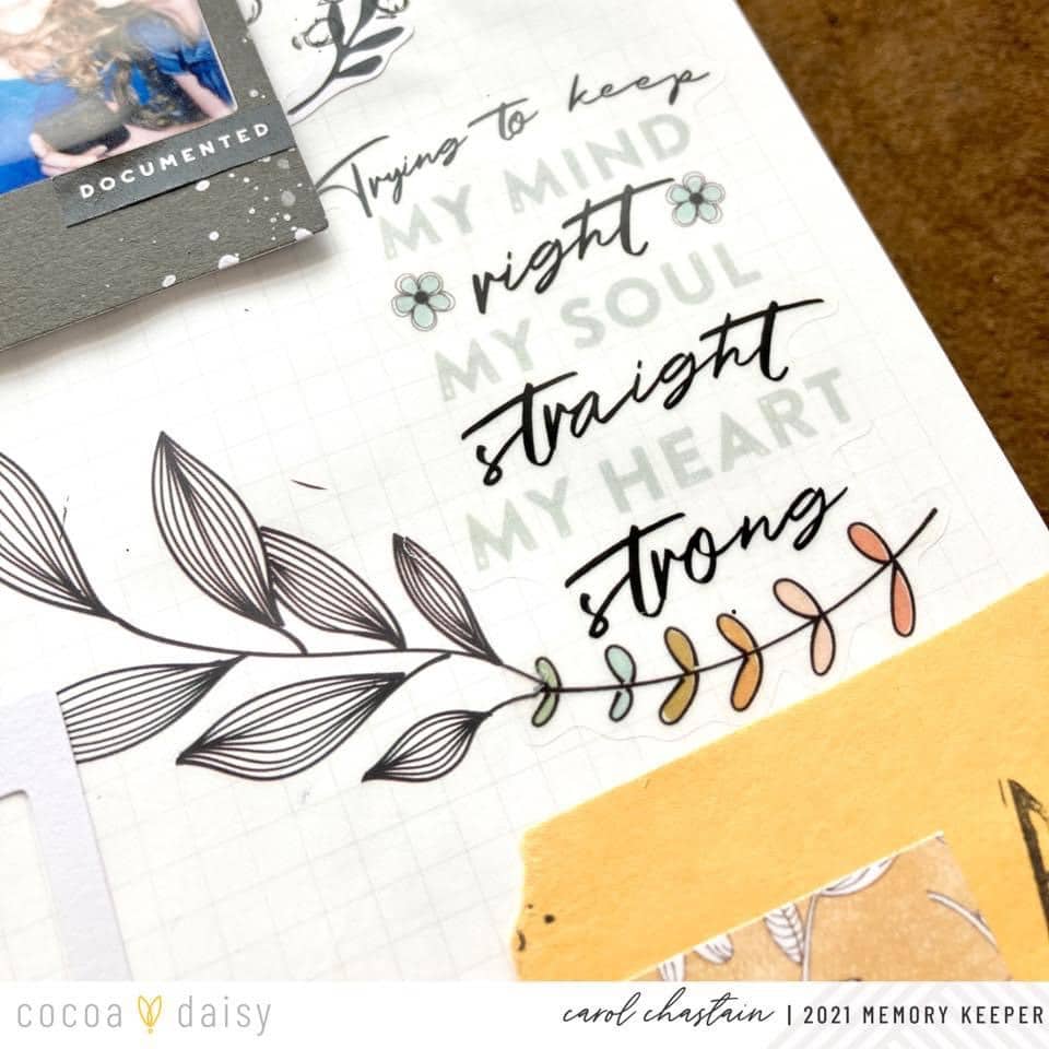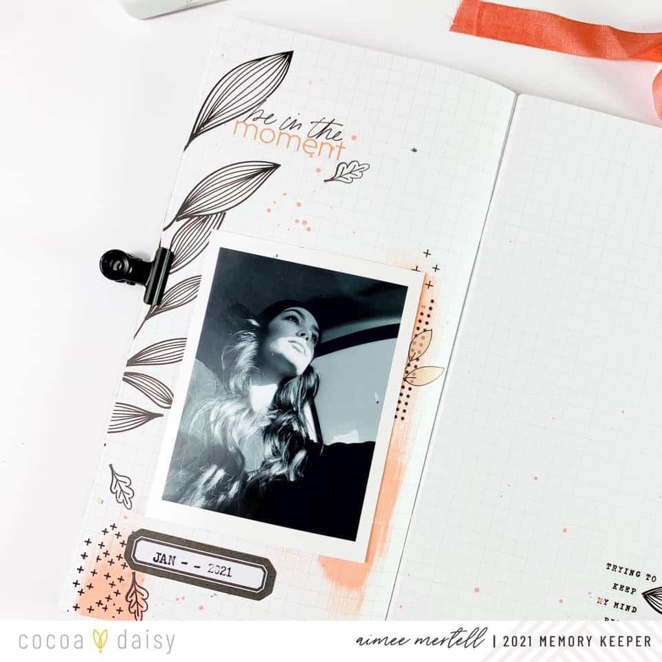 Next, I wanted to add a pop of color to compliment all the black on my page so I picked out a bright coral acrylic paint and made some smudges behind my photo as well as the bottom of the page. I focused mainly on rub-ons and stamps for embellishments to keep the page relatively flat. I chose a variety of leaves, pluses, doodles, and sayings from both the Doodles and Dashes Modern Memory Keeping Kit and the Traveler’s Notebook Memory Keeping Kit rub-on sheets.