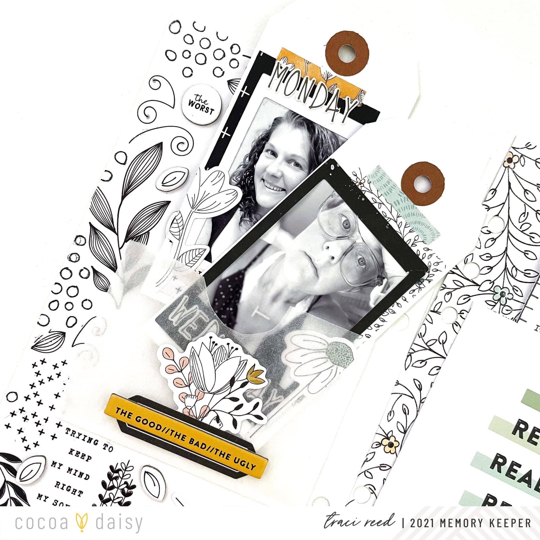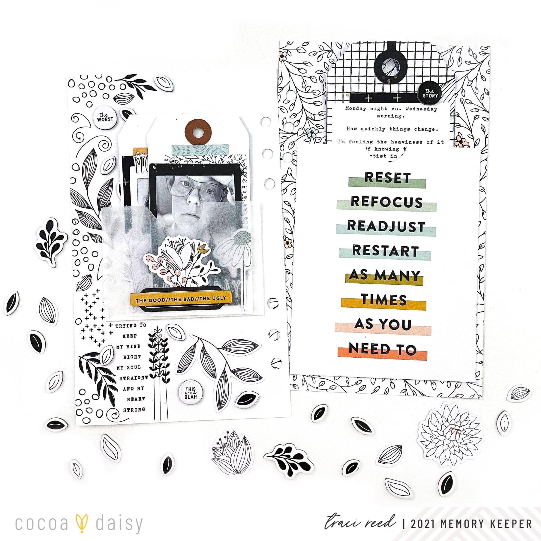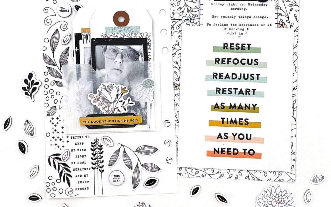 The Doodles & Dashes Collection features a generous array of black and white touches. If you are looking to create some contrast in your creative designs, consider making a black and white spread, with hints of color as our Creative Team has done in this post.