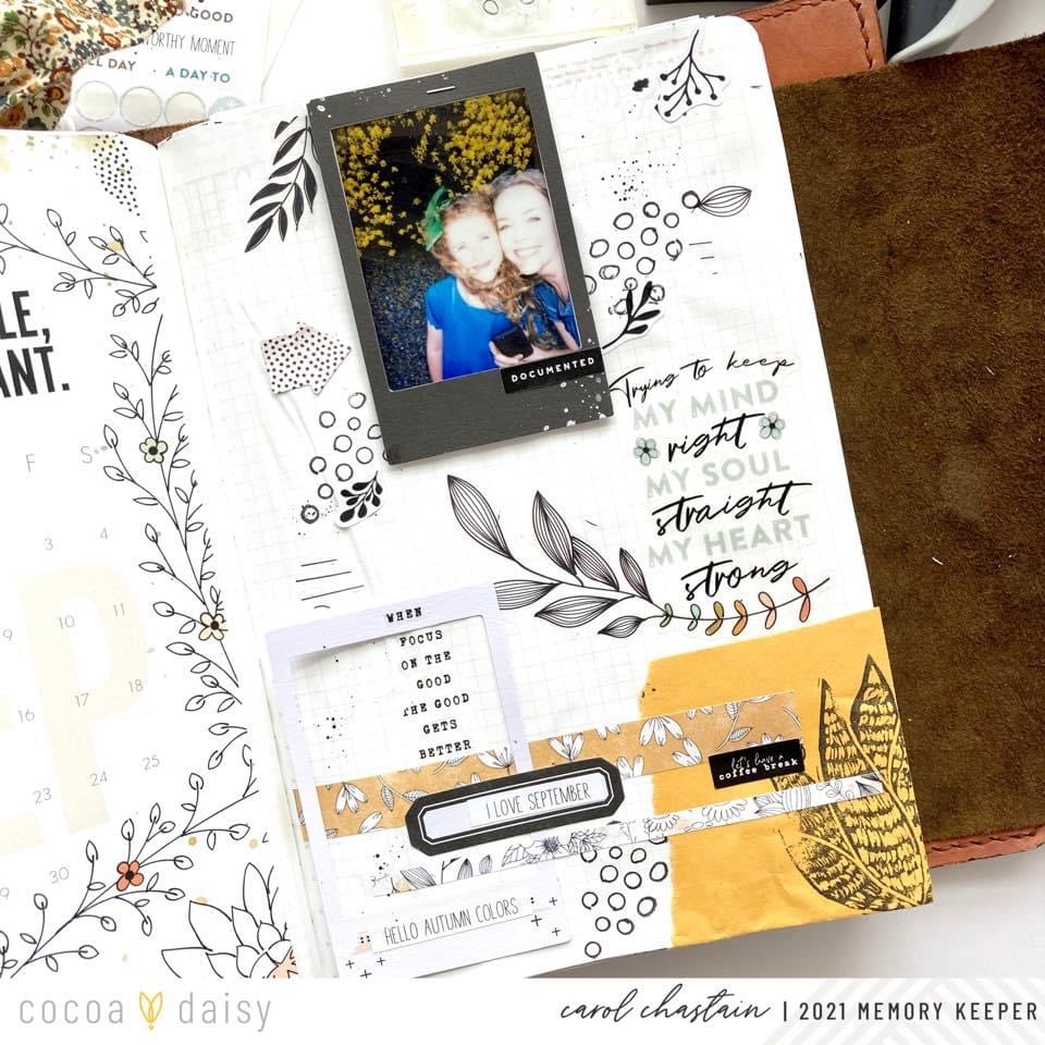 “A new month means a new monthly spread and Y’all, I love September! I used the front piece of the Doodles and Dashes A5 Planner Inserts for the left side of this spread, adhering it down so that the tab would stick out off of the page. For the right side of the spread, I used the Doodles and Dashes Classified: Memory Keeping Kit, Doodles and Dashes Traveler’s Notebook Memory Keeping Kit, and Doodles and Dashes Memory Keeping Sticker Kit to build all my layers for the intentions I’m setting this month.
