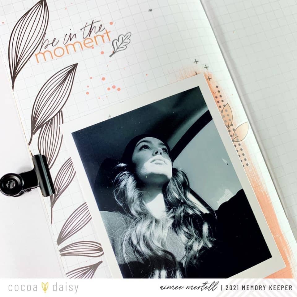 I found that the, “be in the moment” rub-on saying tied in the coral shade from the acrylic paint perfectly and also helped to give some context and feeling to the layout. Quick, simple, beautiful, and high contrast. Super easy to achieve with Doodles and Dashes!”