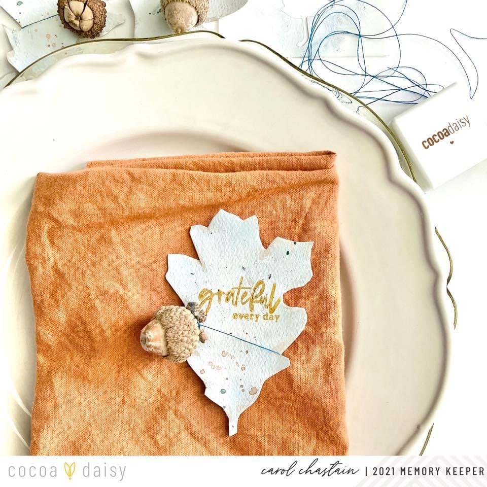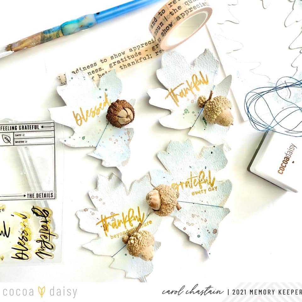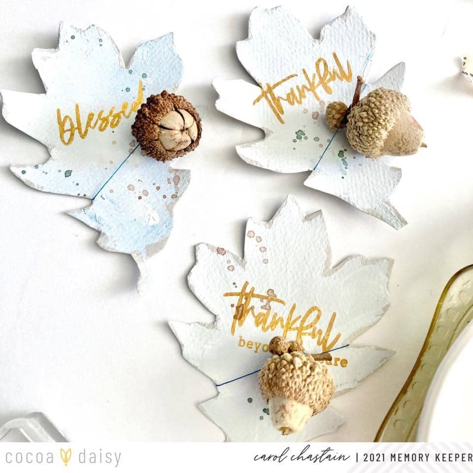 I combined the stamps from the Gather Traveler’s Notebook Memory Keeping Kit, some acorns, and watercolor splatters to create a fun project I plan to use for a tablescape.