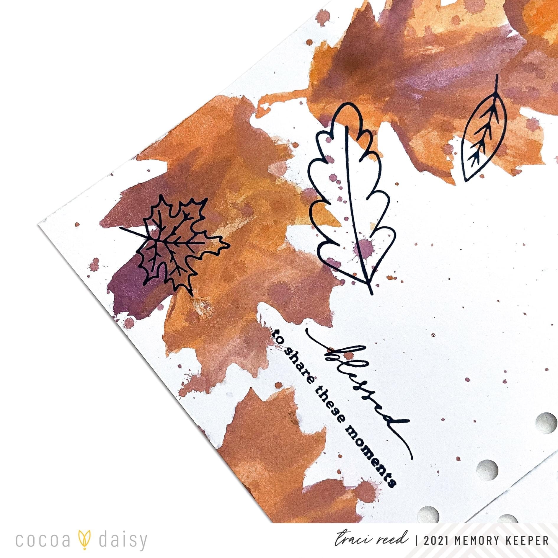 I pulled out some coordinating inks and got to work! When it was all dry, I used the leaves from the Gratitude Stamp Set + navy ink to stamp over the watercolor leaves for a beautiful layered mixed-media effect.