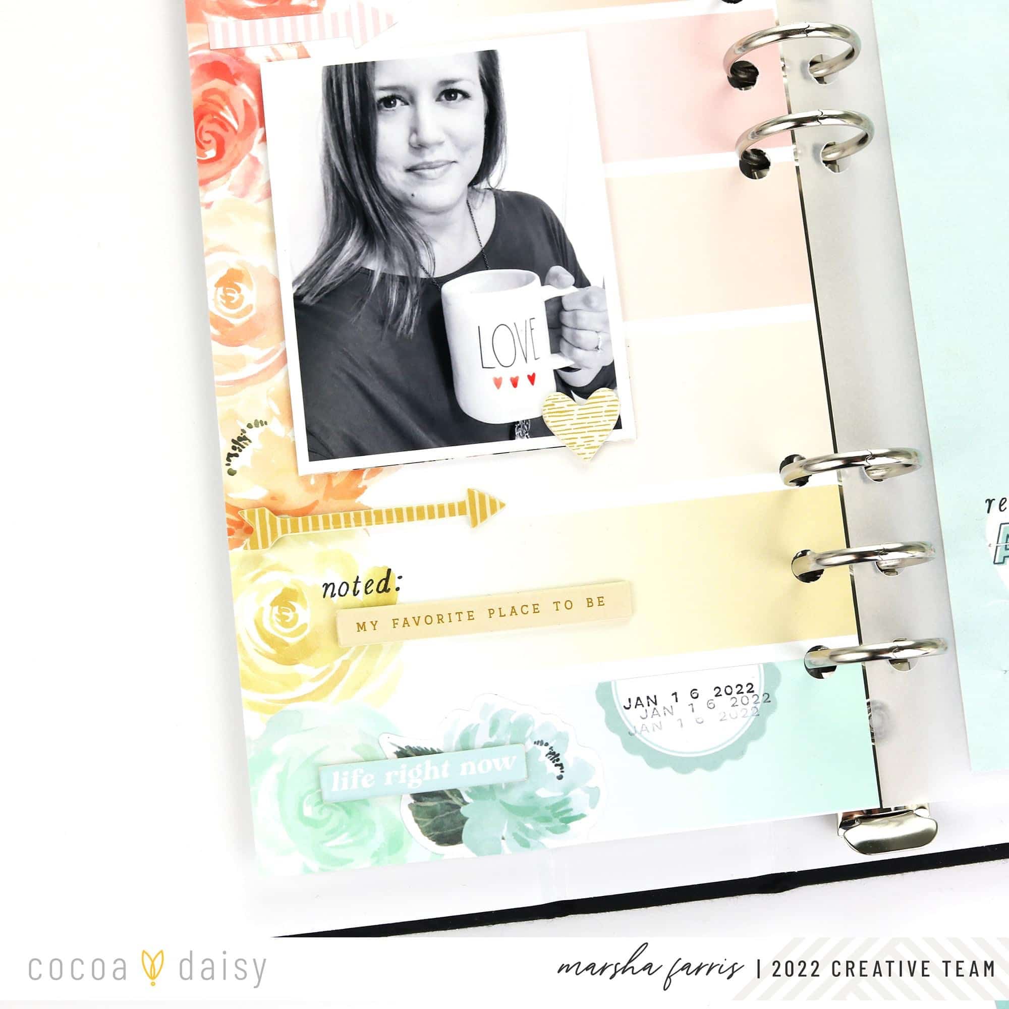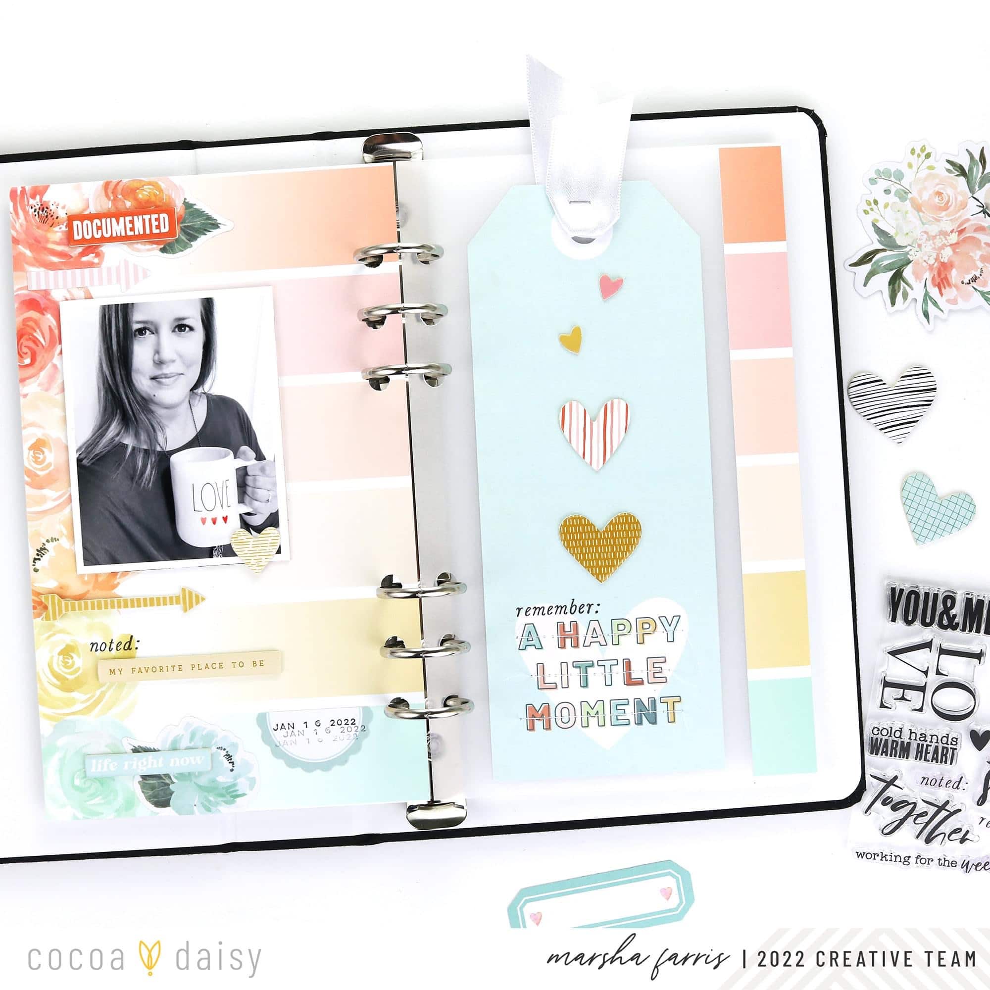 The dashboards from the Elegance Blooms Day Planner Dashboard Kit feature a beautiful floral paper with stripes, and I thought it would be perfect to use as a background. So I trimmed the paper to fit the album and used chipboard and die-cut pieces from the Elegance Blooms Traveler’s Notebook Memory Keeping Kit to embellish the page.