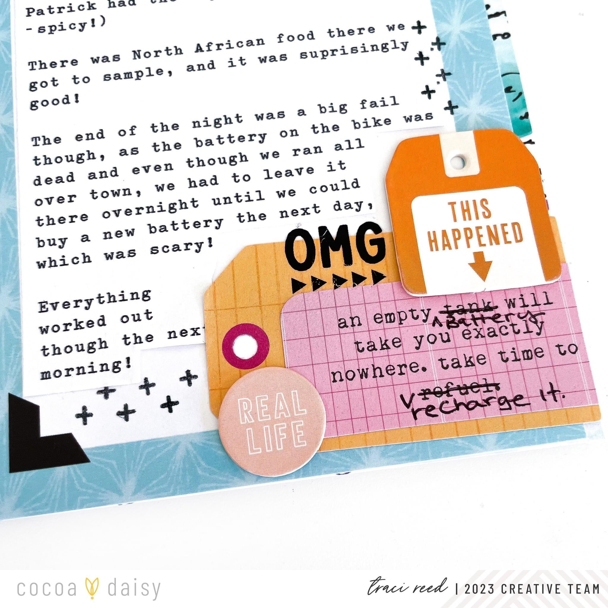 The story is about a good day turned disaster night, but I wanted to focus mainly on the good day portion, so I only dedicated this small corner to snark because I knew it would be in the same visual area as the journaling that corresponded to it. I used chipboard, stamps, tags, and one of the fun quotes (that I edited) to set the mood and create depth.