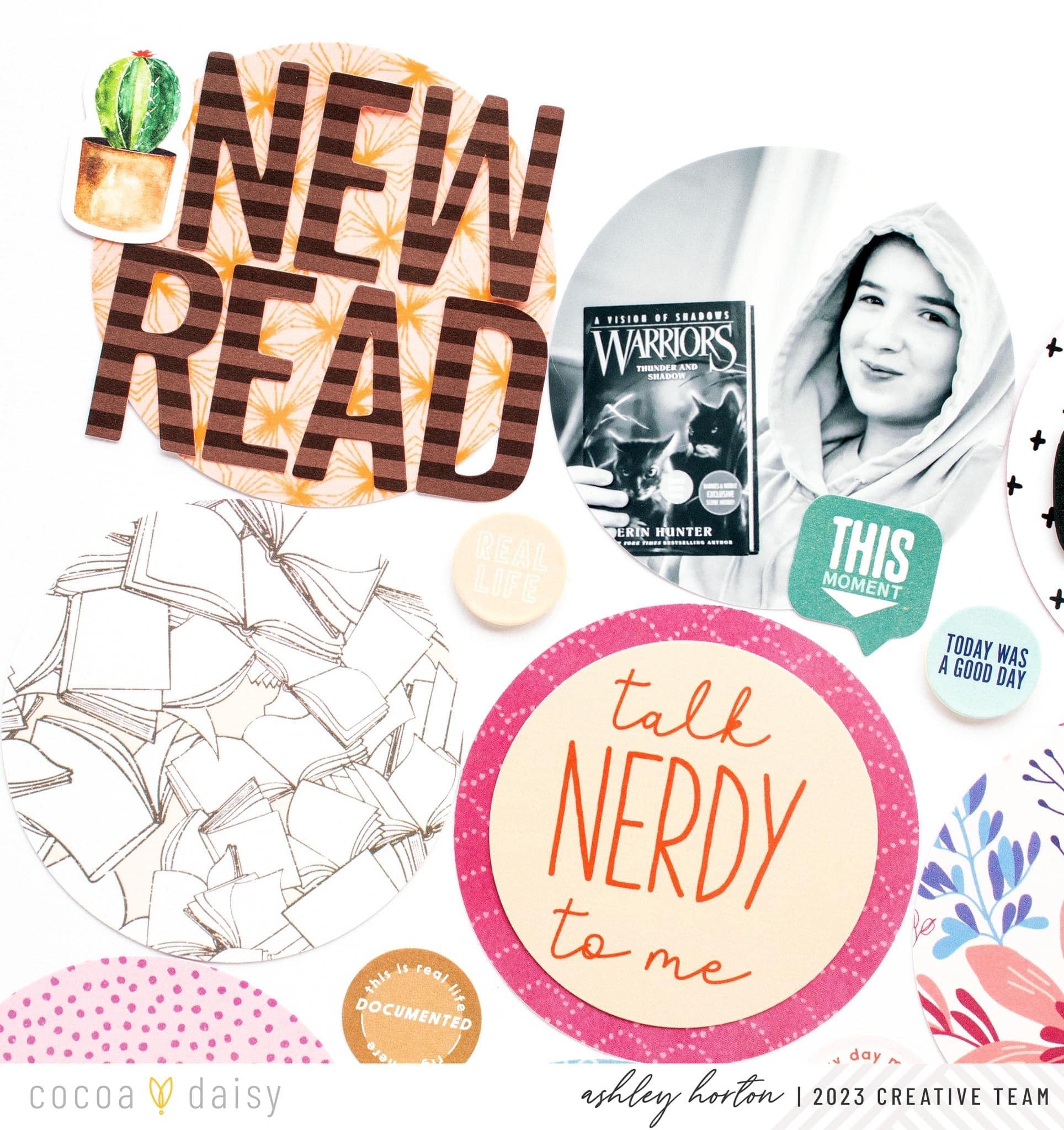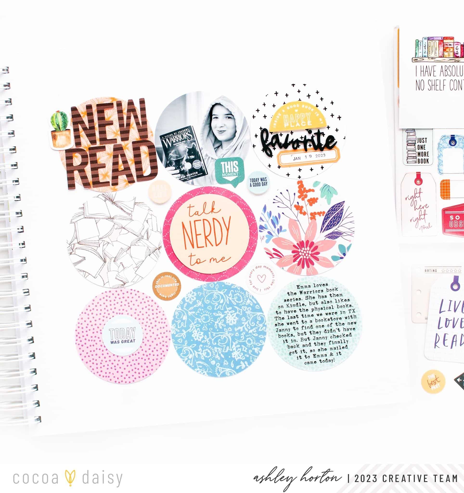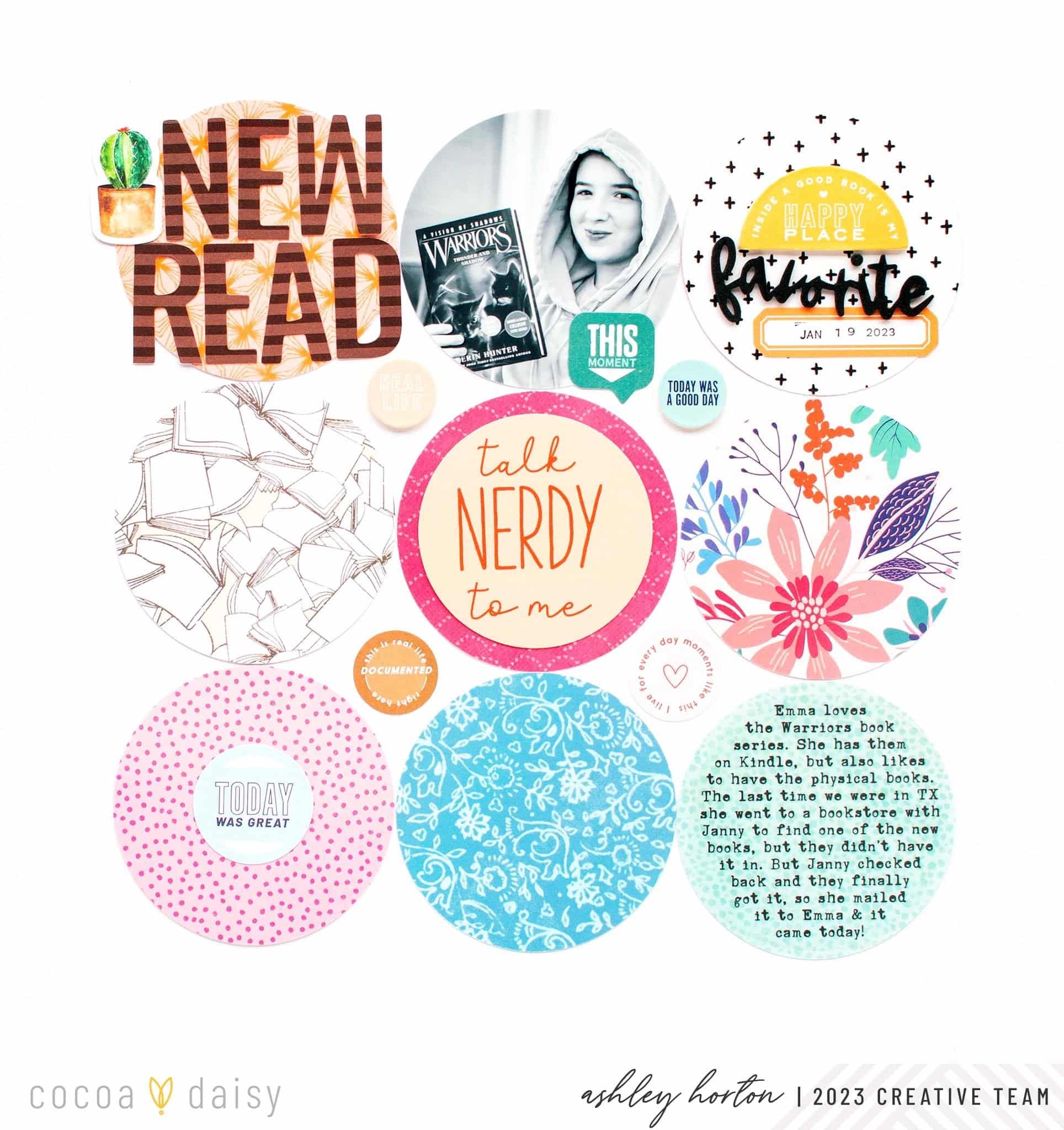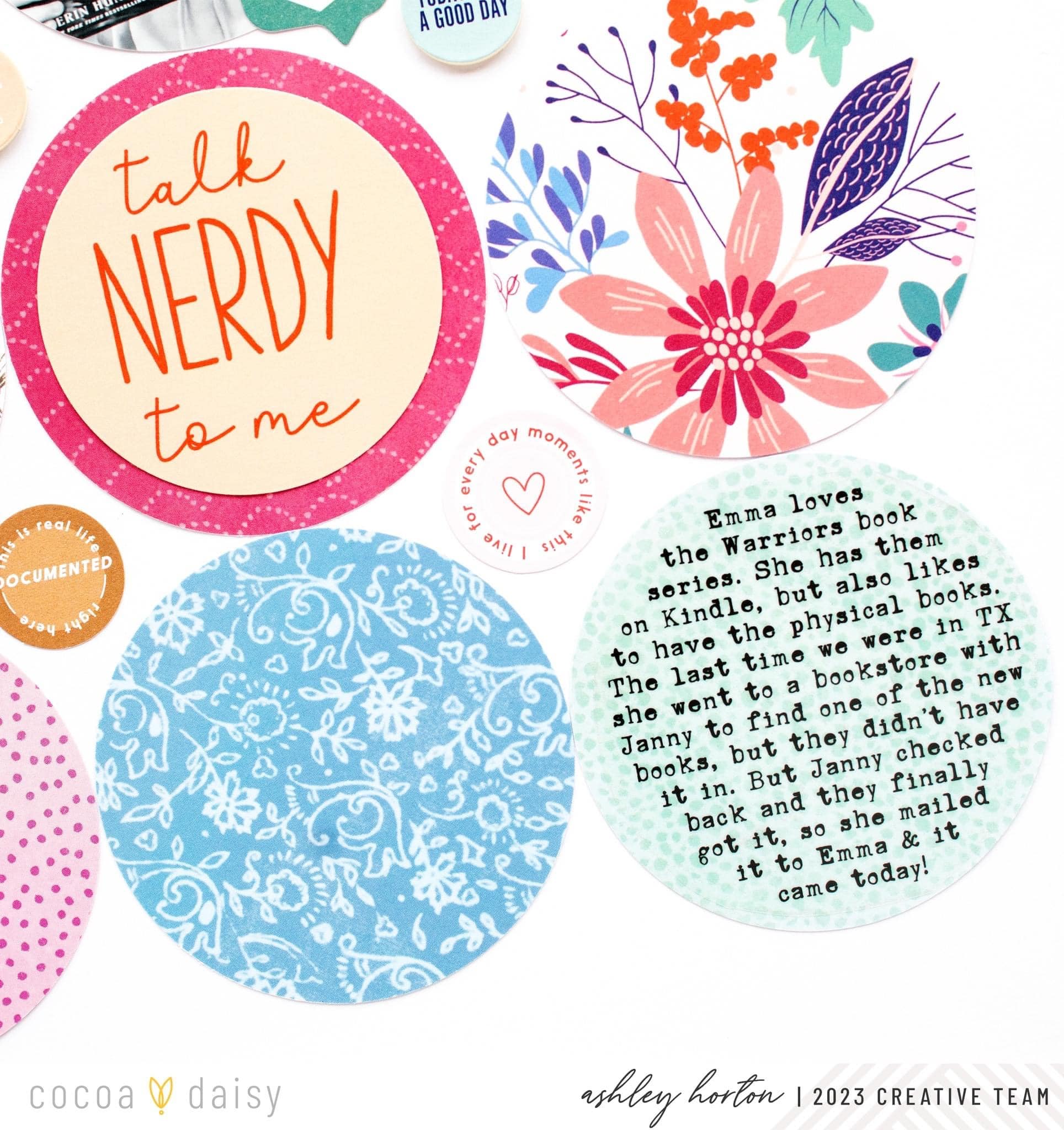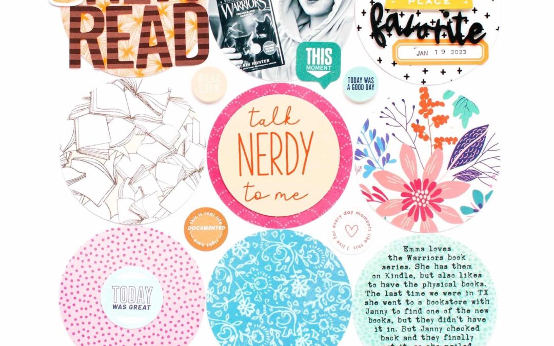 From there, I used some other circle embellishments to go along with my larger punched circles. And, I punched out one of the phrases from one of the pocket cards in the Bookish Modern Memory Keeping Kit to go in my center circle. I love altering the pocket cards!! I finished off the layout, by adding my journaling to the last circle in my grid design. See the whole process in this Instagram Reel.