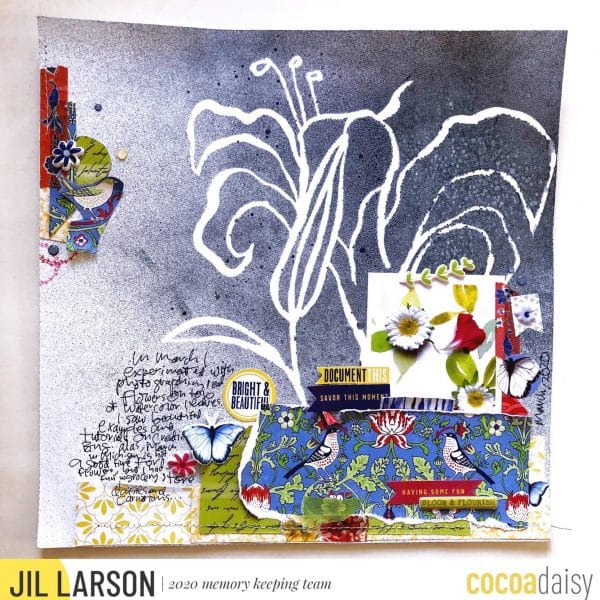 “My mixed media technique for this 12×12 layout was simply to spray navy ink through a large floral stencil for a dramatic background. I then built a layered paper block from the bottom of the page with my photo placed just above these layers.”