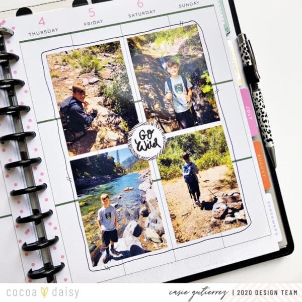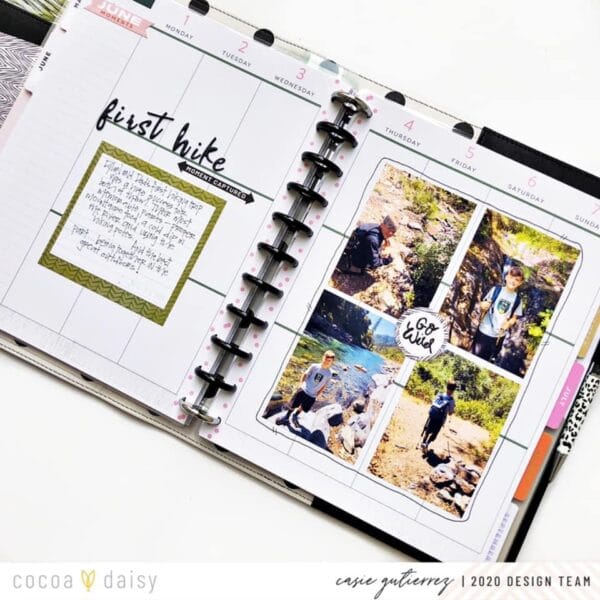 “This month I took a travelers notebook sketch and translated it into a big happy planner layout. Following the sketch, I used 4 photos in a vertical grid on the right side of the layout. My son and husband went on their first father-son hike and he took 4 pictures so it worked out perfect for the story to tell.”