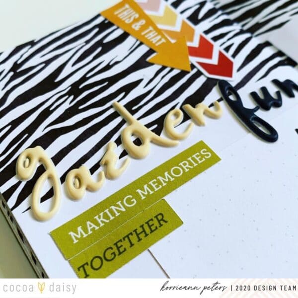 “I wanted my title to stand out from the zebra print so I used the cream Alpha stickers for Garden and then the black alphas for Fun. I used a die cut for the sub-title and cut then glued it in place under my title.”