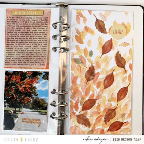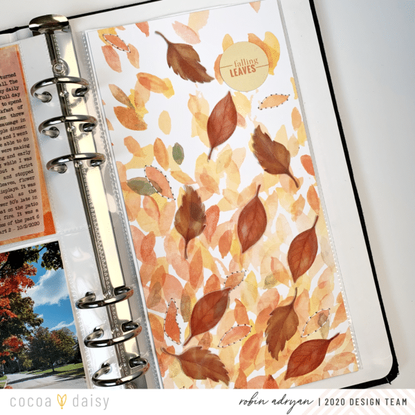 In fact, I used the free planner printable to create my design with vellum in my traveler’s notebook album. My layout is based on a planner paper with leaves from Frost and Flannel which I cut down to fit in my TN album.