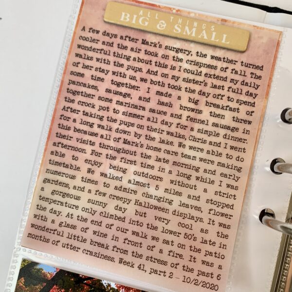 I wanted to incorporate vellum throughout my design and decided to print my journaling on plain vellum then laid it over a piece of patterned paper from the memory keeping kits.